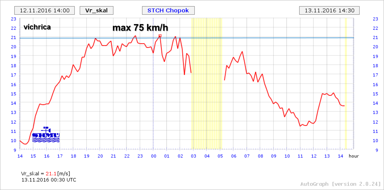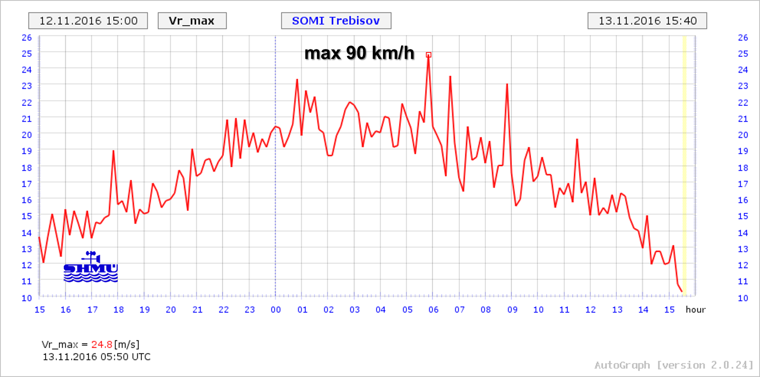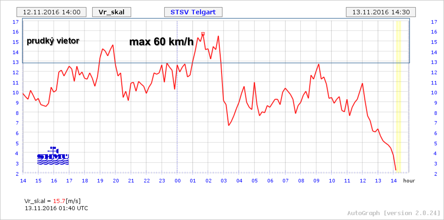 Obr. 3: Priebeh rýchlosti vetra v Telgárte 12. a 13.11.2016