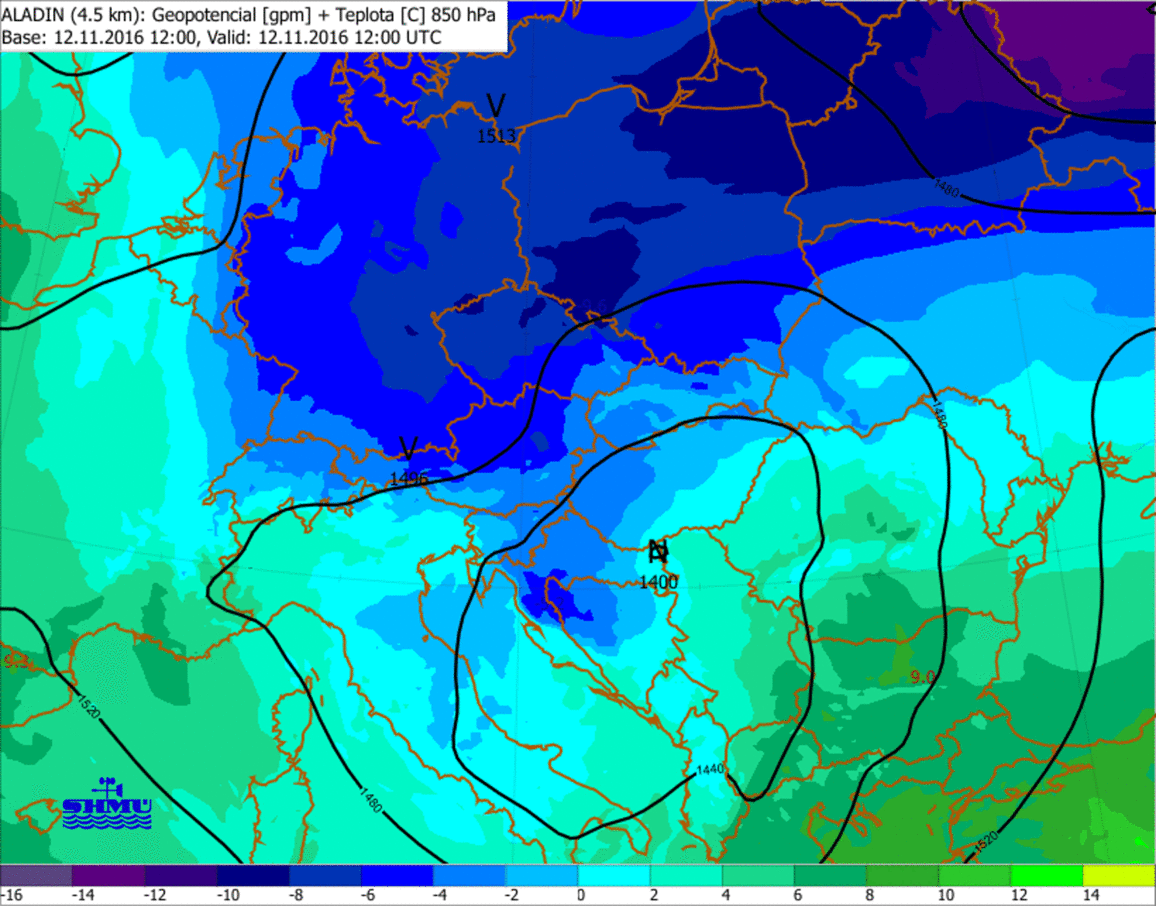 Animácia teploty vzduchu v hladine 850 hPa podľa modelu ALADIN (predpoveď na 72 hodín - 4,5 km rozlíšenie)