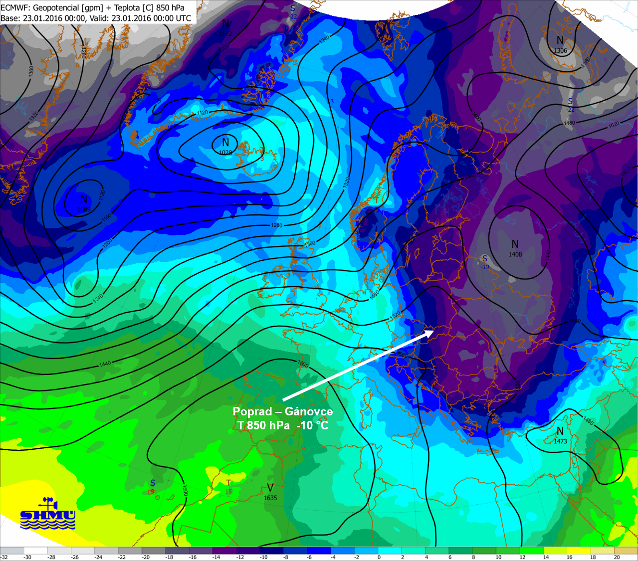 Obr. 1: Reanalýza teploty vzduchu v hladine 850 hPa zo dňa 23.1.2016 o 00 UTC podľa ECMWF