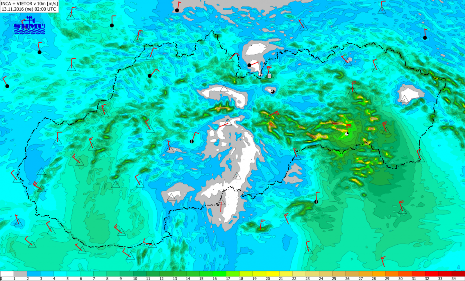 Obr. 2: Analýza rýchlosti vetra INCA + SYNOP 13.11. o 3:00 SEČ