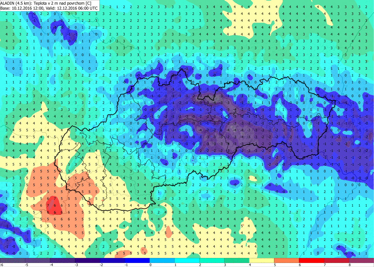 Animácia 2 - Predpoveď teploty vzduchu vo výške 2 m nad povrchom na území Slovenska 12.12. od 06:00 UTC do 22:00 UTC.