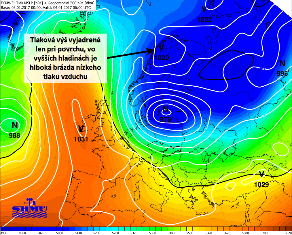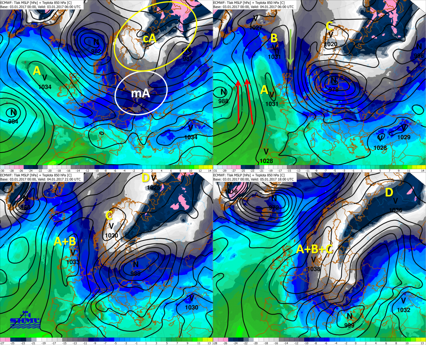 Už večer 4.1. sa tlaková výš nad Britskými ostrovmi prepojí s novou výšou pri Islande a po prednej strane tohto útvaru bude do západnej Európy prúdiť od severu morský arktický vzduch (ktorý sa však rýchlo transformuje). Nad Škandináviou bude v kontinentálnom arktickom vzduchu ďalej mohutnieť ďalšia tlaková výš, podobne aj v okolí Novej Zeme (na obr. 1 vľavo dole ozn. písmenom "D"). Všetky spomínané výše sa vo štvrtok 5.1. prepoja a medzi touto rozsiahlou oblasťou vysokého tlaku vzduchu a oblasťou nízkeho tlaku nad juhovýchodom kontinentu do našej oblasti prenikne od severu až severovýchodu veľmi studený kontinentálny arktický vzduch (v hladine 850 hPa (výška cca 1500 m n.m.) bude na severe menej ako -20 °C). V našej oblasti však dlho nezotrvá, už koncom týždňa sa od západu znovu oteplí. Celý vývoj je na animácii 1.