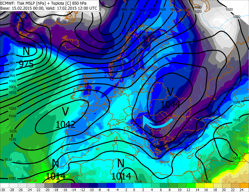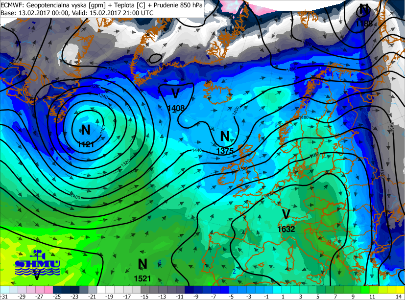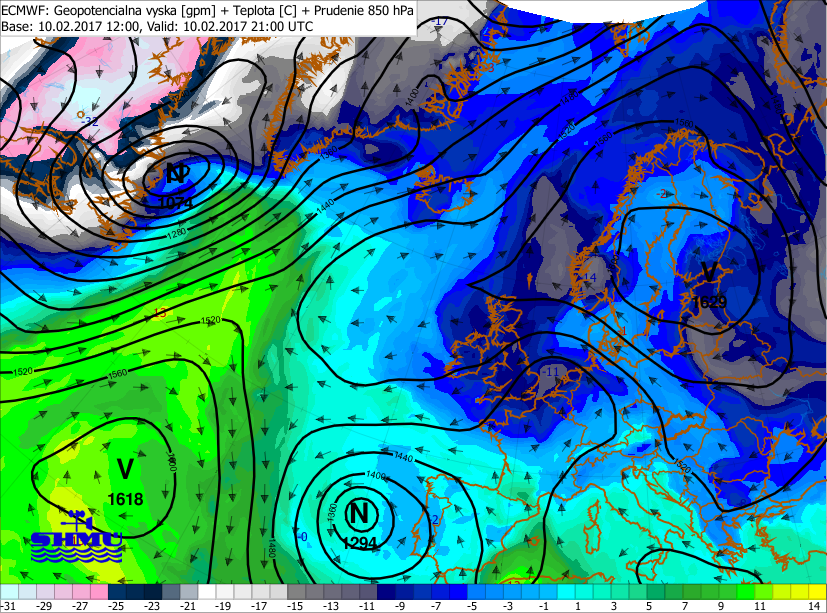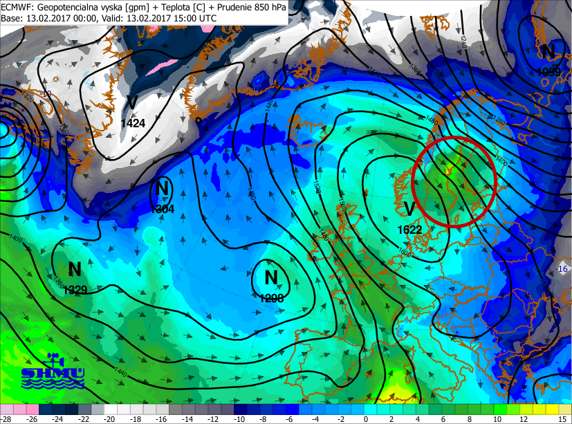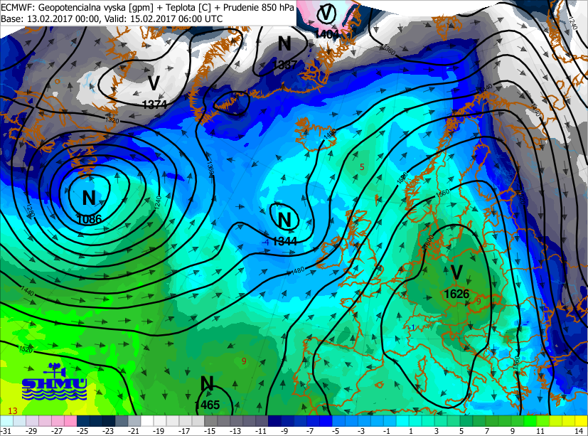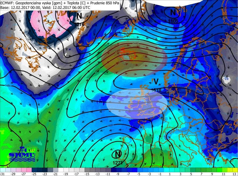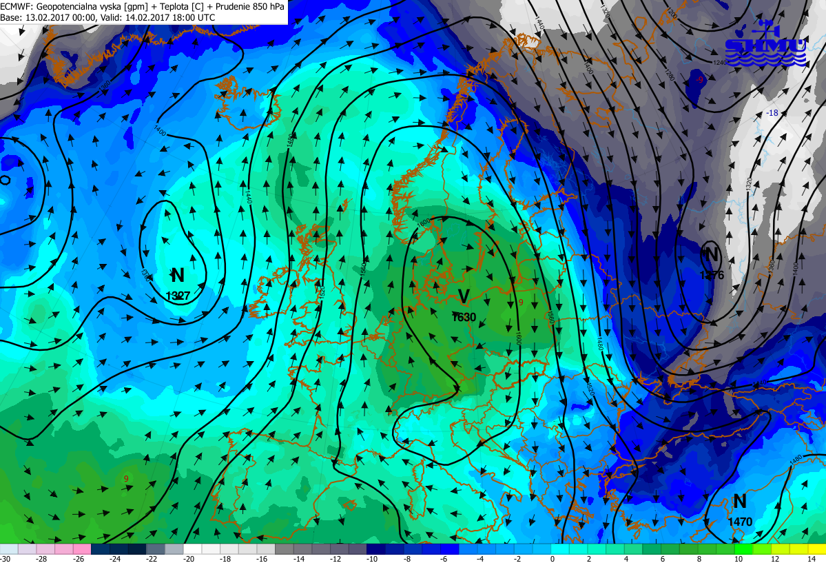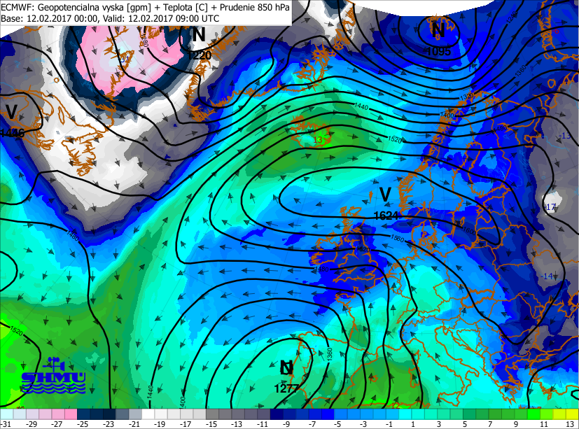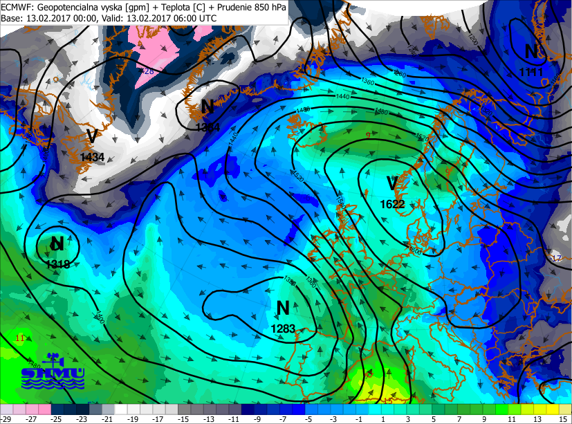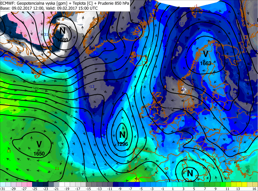 Animácia 1 - Analýza a predpoveď teploty, geopotenciálnej výšky a prúdenia v hladine 850 hPa z modelu ECMWF v dňoch 9.2. až 16.2.2017.