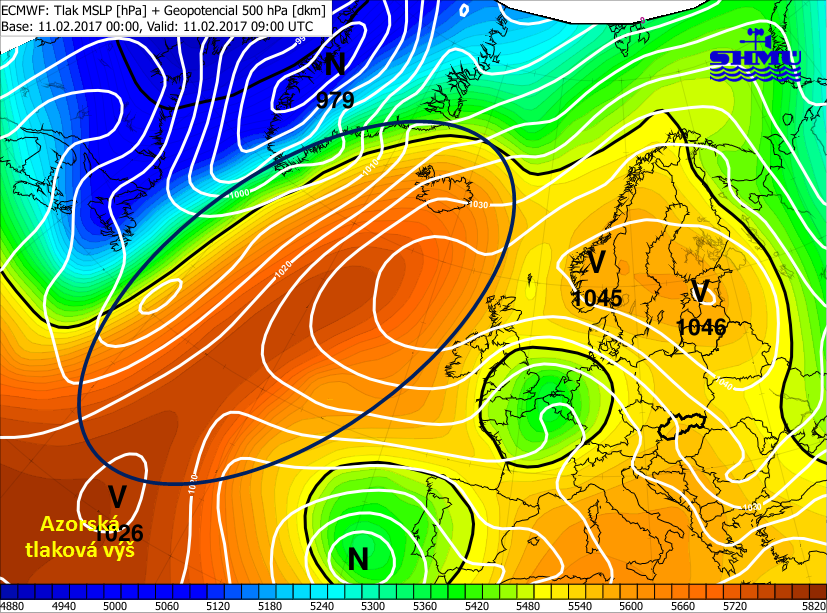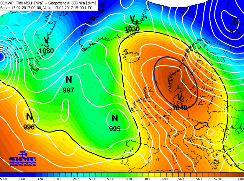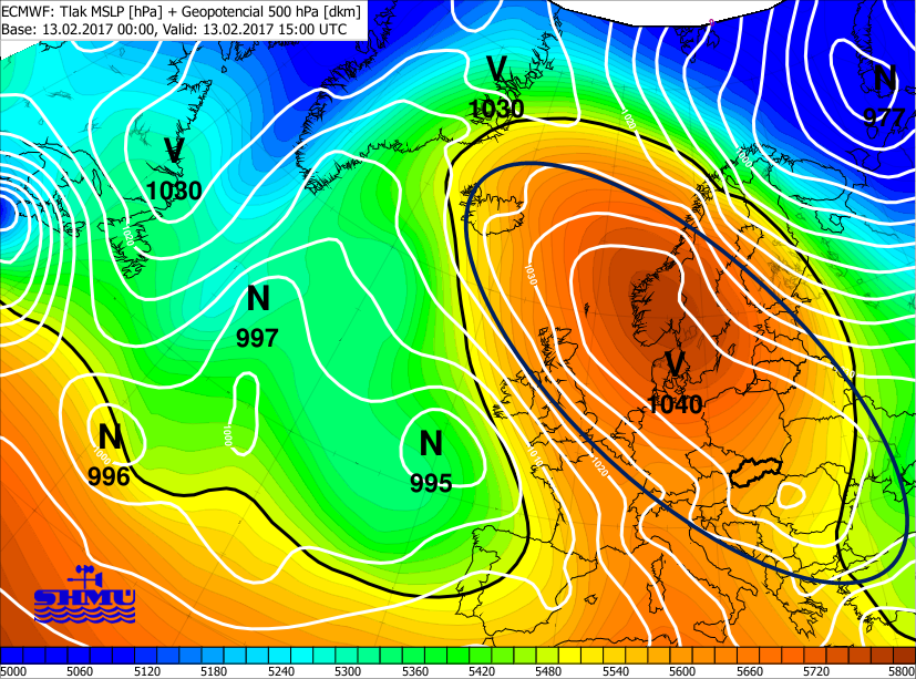 Animácia 2 - Analýza a predpoveď prízemného tlakového poľa (biele izočiary) a geopotenciálnej výšky hladiny 500 hPa (farebná škála) z modelu ECMWF v dňoch 9.2. až 16.2.2017.