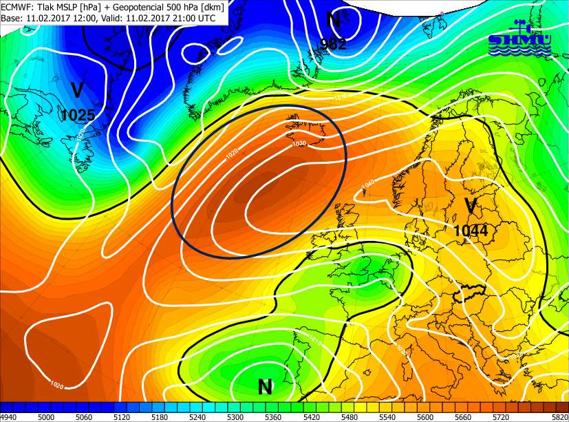 V úvode animácie 1 vidieť, že po prednej strane tlakových níži v okolí východnej Kanady prúdil 10. a 11.2. od juhu teplý vzduch do oblasti južne od Grónska, pričom 12.2. sa dostal aj do oblasti Isladnu. Súčasne sa v tomto teplom prúdení zdvíhali geopotenciálne hladiny vyšších vrstiev troposféry, čím tu vznikol výbežok tlakovej výše (Azorskej) a veľmi rýchlo aj samostatné anticyklonálne jadro (vývoj na animácii 2). V prízemnom tlakovom poli tak v oblasti severnej Británie prebiehala anticyklogenéza (vývoj tlakovej výše) spôsobená teplým západným prúdením na jej severnej strane, studeným východným na južnej a taktiež aj s výraznou dynamickou podporou (spomínané anticyklonálne jadro vo vyšších hladinách). Po prednej strane tejto výše teda ďalej prúdil teplý vzduch cez Nórske more nad Škandináviu. 13. februára nad Škandináviou tiež vidieť ďalšie oteplenie tohto vzduchu, čo je spôsobené tzv. fohnom za Škandinávskymi vrchmi (teplý padavý vietor na záveternej strane). Súčasne sa dnes v prízemnom tlakovom poli sformoval rozsiahly pás vysokého tlaku vzduchu siahajúci od Islandu až po Čierne more, pričom vo vyšších hladinách je stred nad južným Nórskom.