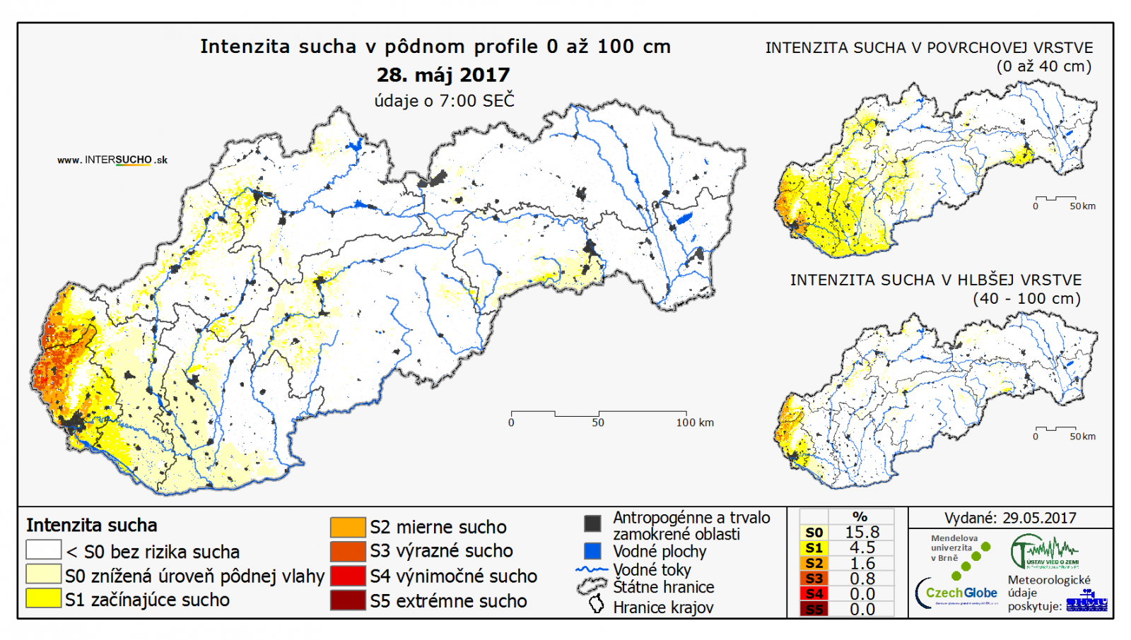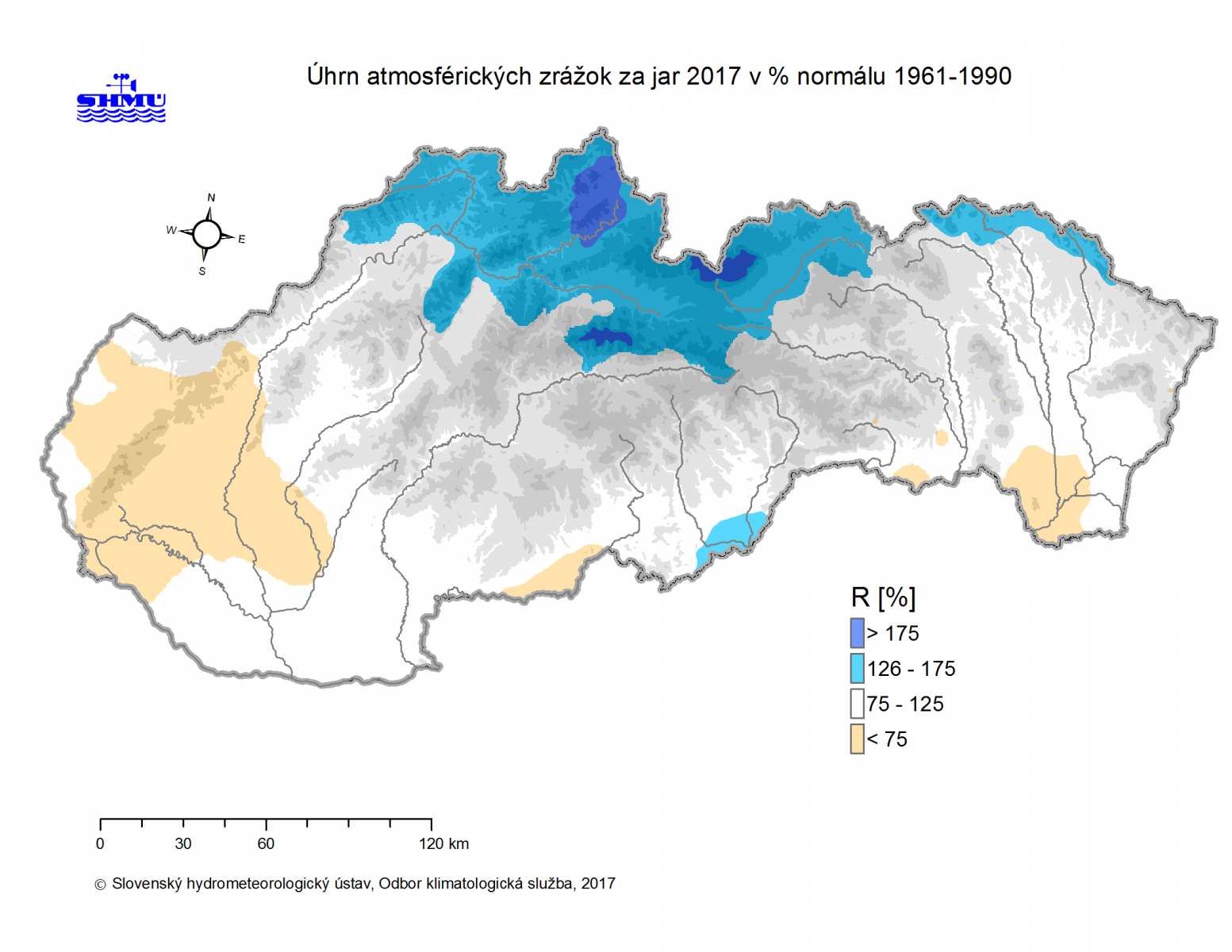 Jar 2017 bola z hľadiska sezónneho úhrnu atmosférických zrážok normálna (Obr. 8 vpravo). Významne k tomu prispel predovšetkým apríl, ktorý bol v severných oblastiach Slovenska miestami až mimoriadne zrážkovo nadnormálny. Ostatné dva jarné mesiace boli zrážkovo podpriemerné, najmä na západe a juhozápade Slovenska, kde prevládali v priebehu jari (ale aj obdobia od začiatku roka) suché podmienky s postupne rastúcim vlahovým deficitom.