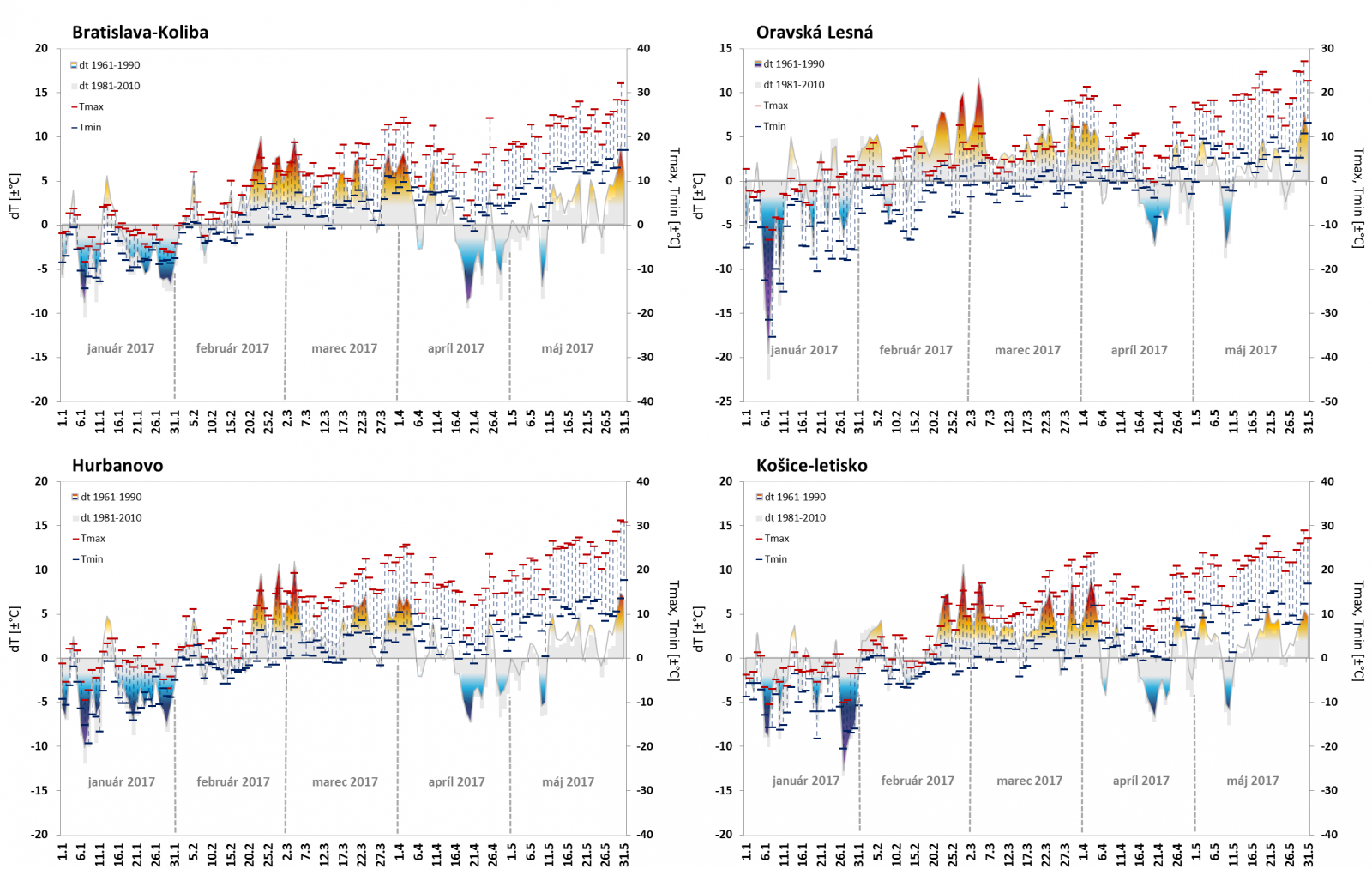 Obr. 3: Vývoj odchýlky priemernej dennej teploty vzduchu, resp. maximálnej a minimálnej teploty vzduchu na vybraných meteorologických staniciach (Bratislava-Koliba, Hurbanovo, Oravská Lesná, Košice-letisko) v porovnaní s normálom 1961-1990 (resp. 1981-2010) v období od 1.1. do 31.5.2017 [Obr. 3]