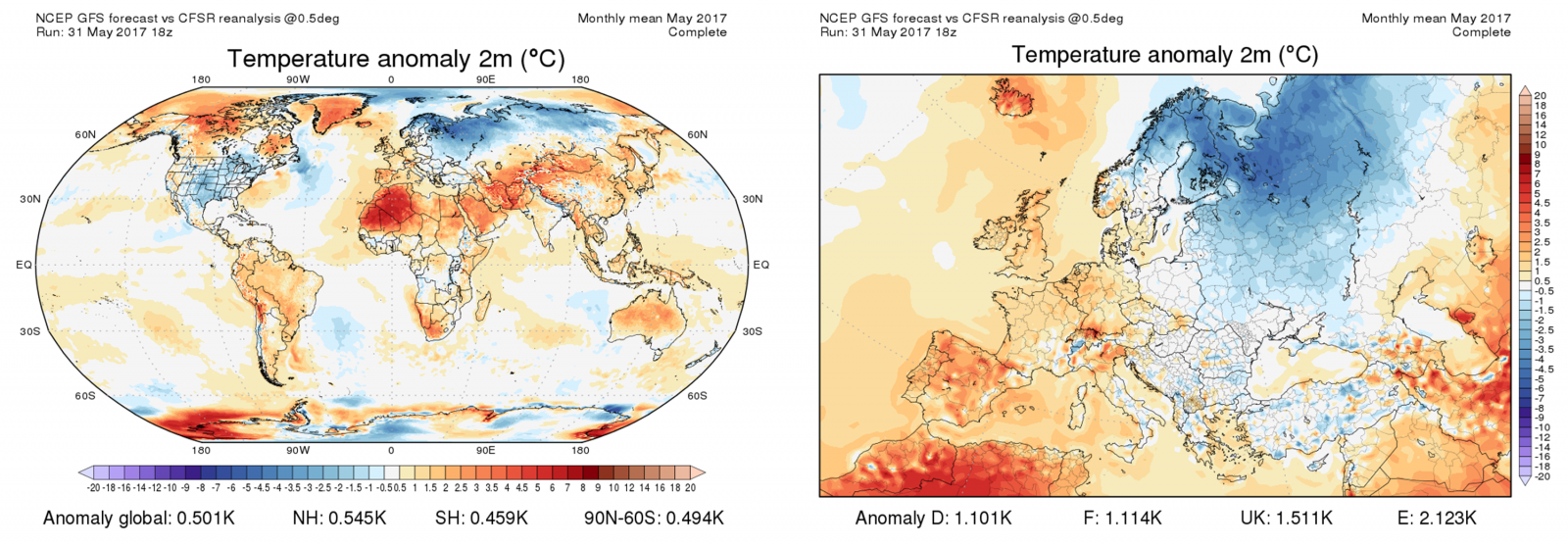 Obr. 10: Odchýlka priemernej mesačnej teploty vzduchu vo svete (vľavo) a v Európe (vpravo) v máji 2017 v porovnaní s normálom 1981-2010, podľa reanalýzy NCEP [Obr. 10]