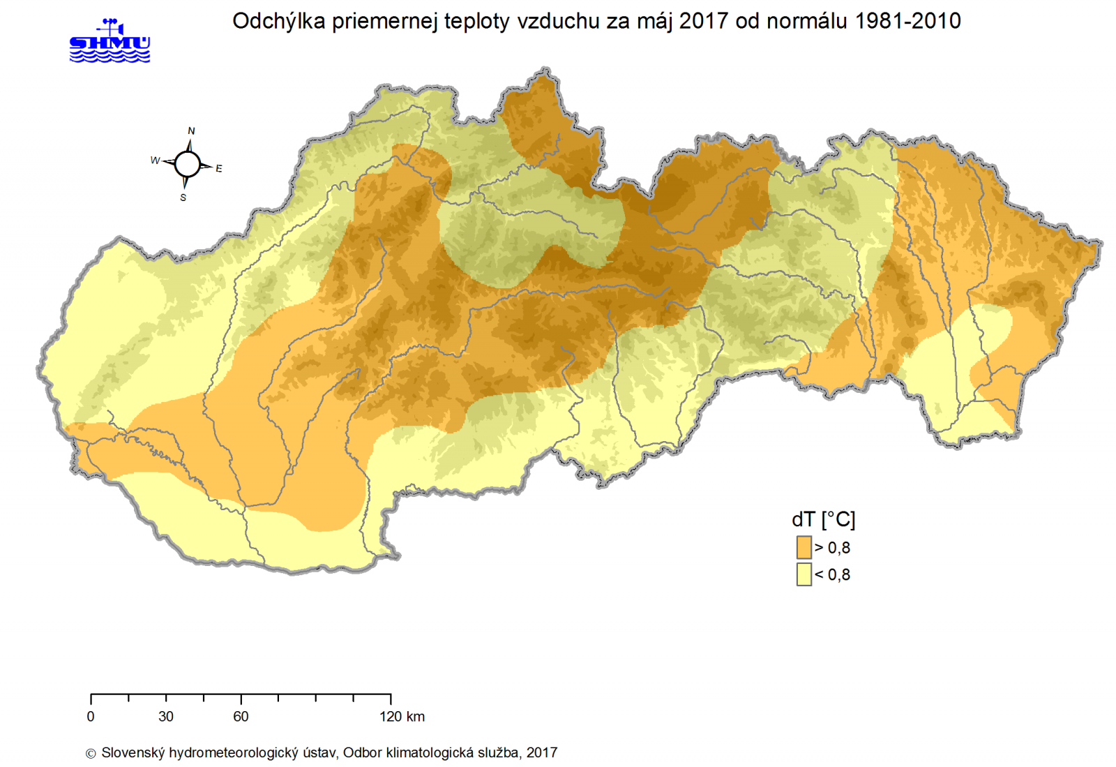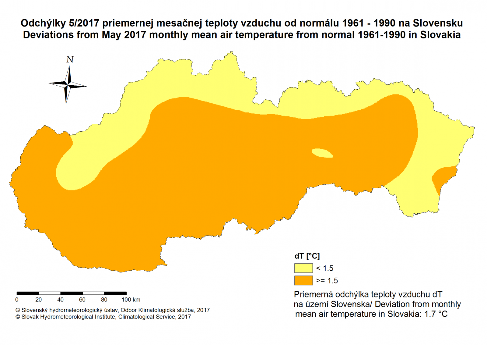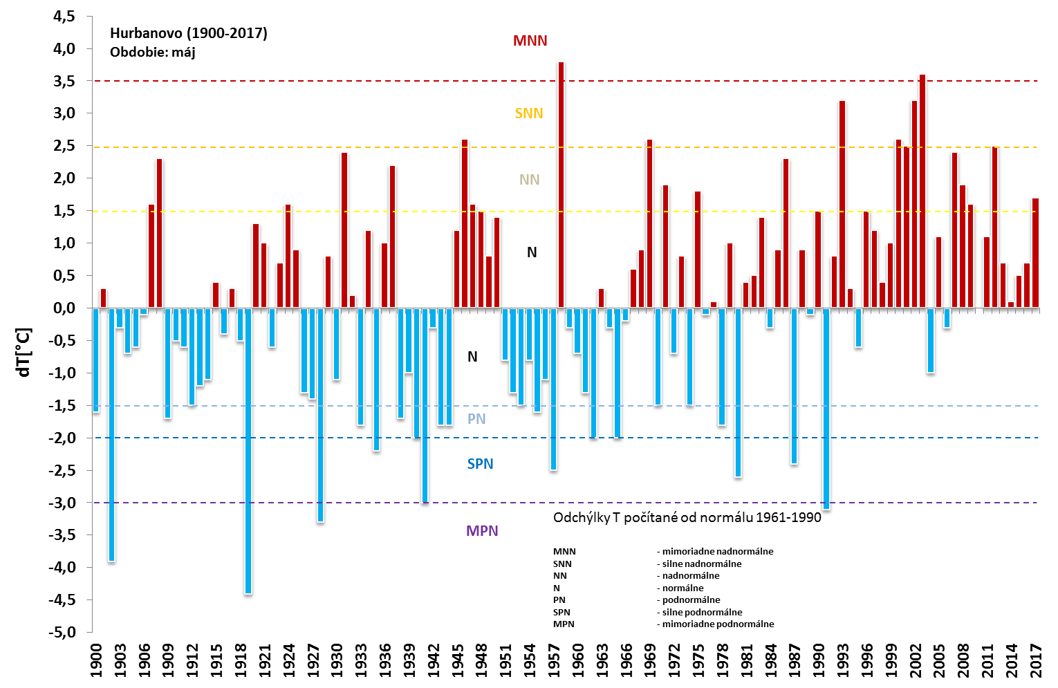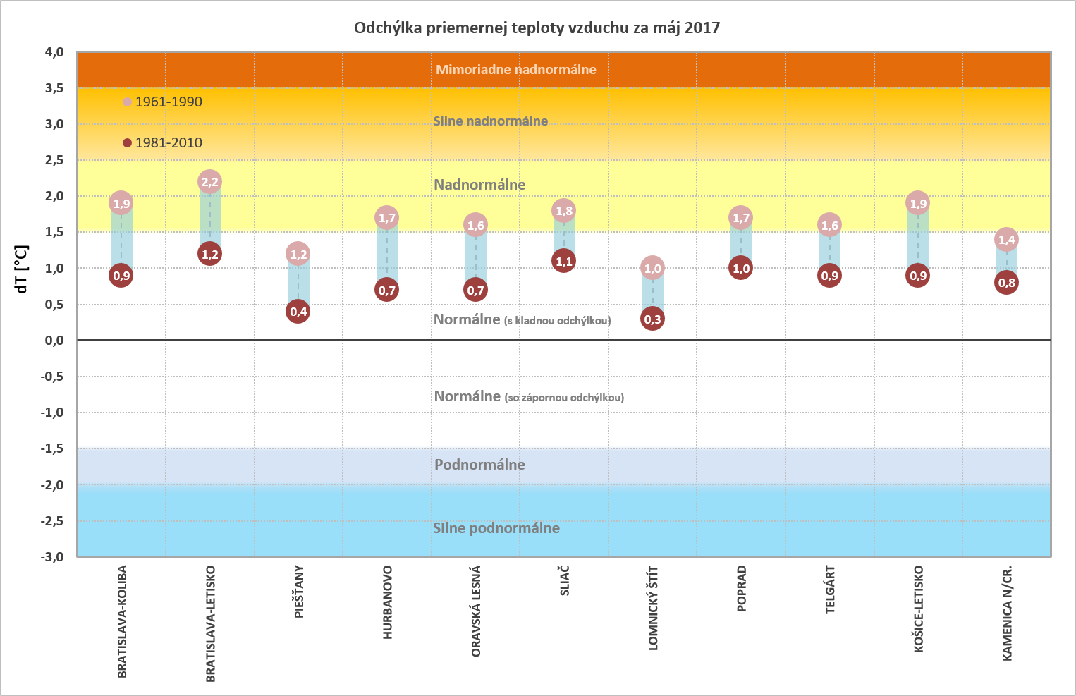 Máj 2017 bol na väčšine územia Slovenska teplotne nadnormálny, s odchýlkami od +0,5 °C (Slovenský Grob) do +2,5 °C (Žihárec), a priemernou územnou odchýlkou +1,7 °C v porovnaní s normálom 1961-1990 (Obr. 1 vľavo). V porovnaní s teplejším normálom 1981-2010 bol uplynulý mesiac teplotne normálny s priemernou územnou odchýlkou +0,8 °C (od 0,0 °C v Dolných Plachtinciach do +1,7 °C v Žihárci). Máj bol relatívne najteplejší na krajnom juhozápade Slovenska, v centrálnej a severnej časti Podunajskej nížiny, na Hornej Nitre a na krajnom východe Slovenska, relatívne najchladnejší na juhu stredného Slovenska (Obr. 2). V Hurbanove skončil máj ako nadnormálne teplý s odchýlkou +1,7 °C (priemerná mesačná teplota vzduchu: 17,3 °C), čím výrazne zaostal za mimoriadne teplými májmi z rokov 1958 (+3,8 °C) a 2003 (+3,6 °C; Obr. 4). Z priebehu dennej priemernej, maximálnej a minimálnej teploty vzduchu vidieť, že počas mája sa vyskytlo len jedno teplotne podnormálne obdobie (okolo 10.5.), zatiaľ čo posledná pentáda bola výrazne nadnormálna (Obr. 3).
