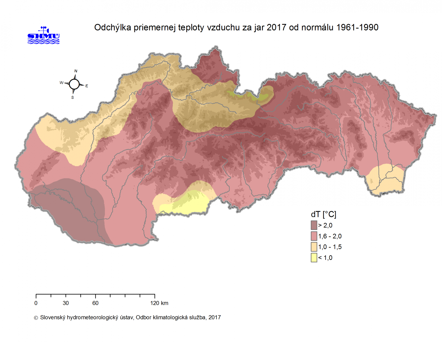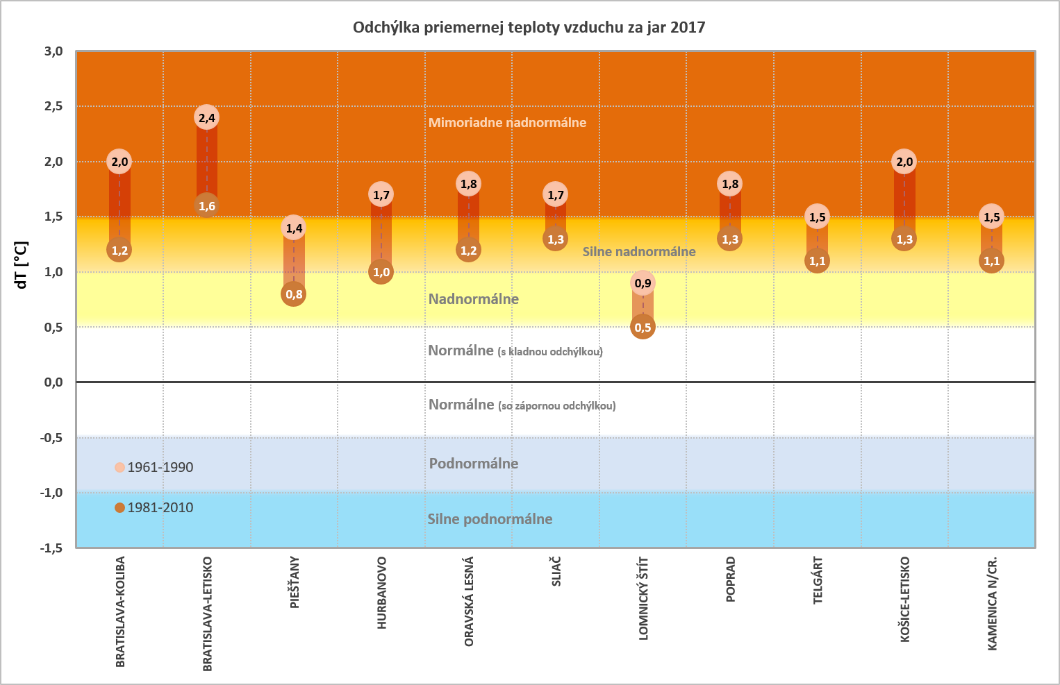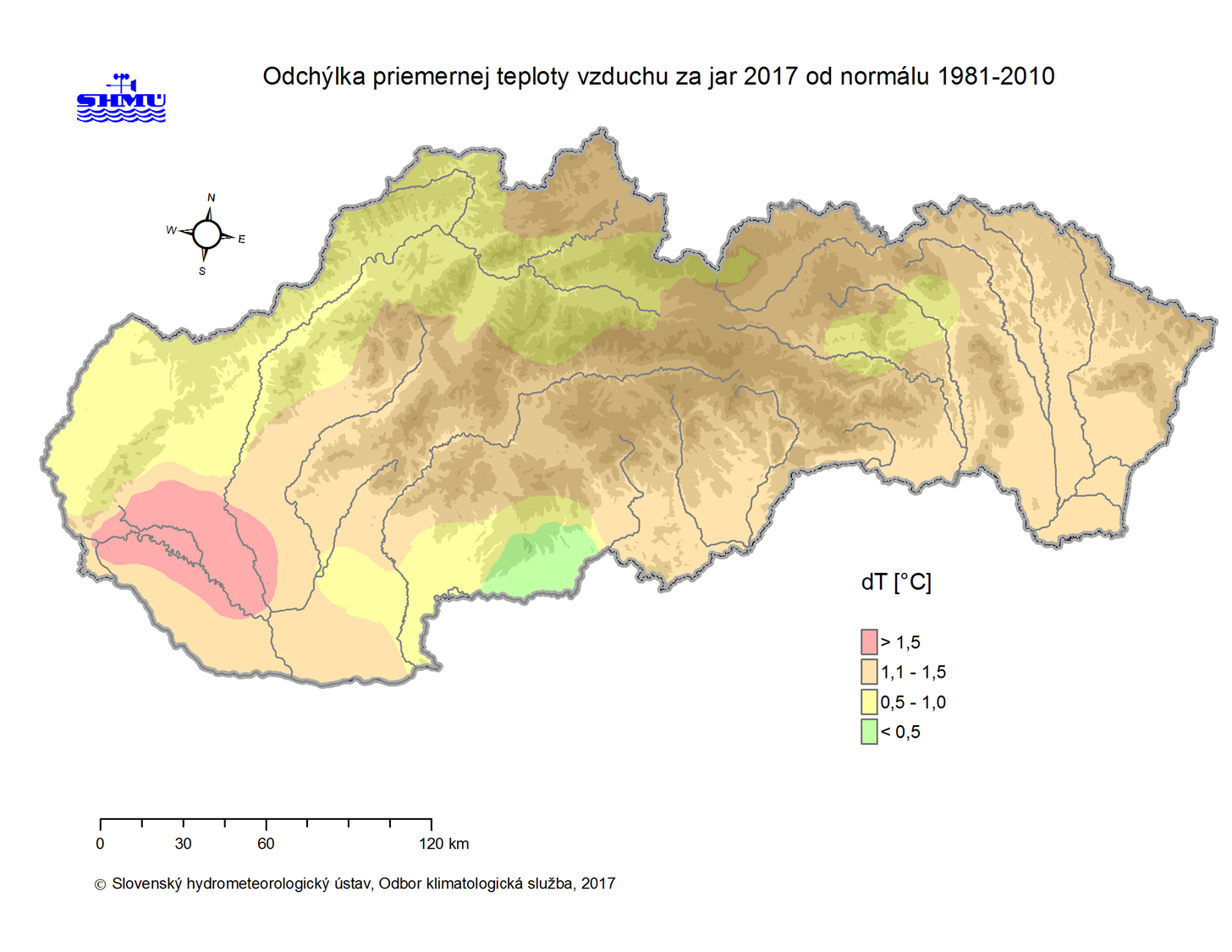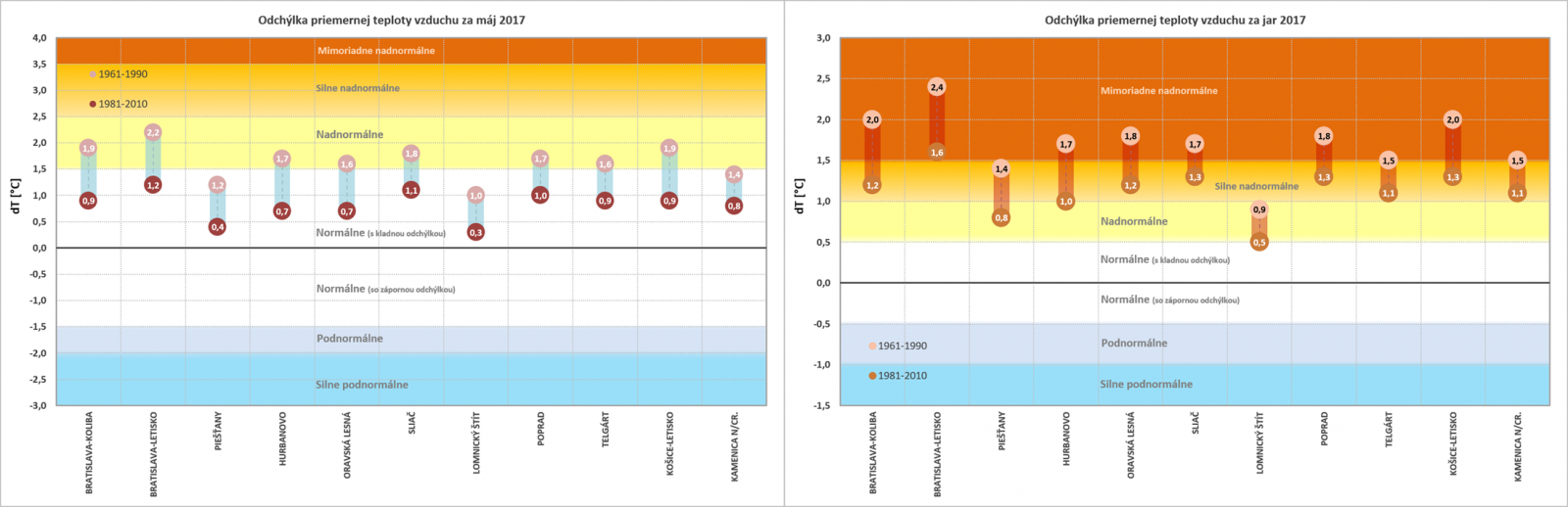 Tohtoročná jar (marec – máj 2017) bola ako celok teplotne mimoriadne nadnormálna, s priemernou územnou odchýlkou od normálu 1961-1990 +1,6 °C (+1,1 °C od normálu 1981-2010; Obr. 1 vpravo), pričom skončila ako 3. až 8. najteplejšia aspoň od roku 1951 (v Hurbanove 6. najteplejšia aspoň od roku 1900 s priemernou sezónnou teplotou 12,2 °C). Jar bola relatívne najteplejšia na krajnom juhozápade Slovenska a v centrálnej časti Podunajskej nížiny, naopak najchladnejšia na severozápade Slovenska a vo vysokých horských polohách (Tatry; Obr. 5). Relatívne najteplejším mesiacom tohtoročnej jari bol marec, ktorý skončil s priemernou odchýlkou +3,7 °C (v porovnaní s normálom 1961-1990) ako druhý až tretí najteplejší marec aspoň od roku 1951. V Hurbanove s priemernou teplotou +9,0 °C bol marec 2017 druhý najteplejší aspoň od roku 1900, zaradil sa za historicky najteplejší marec z roku 2014. Relatívne najchladnejším mesiacom bol naopak apríl 2017 s priemernou odchýlkou -0,2 °C [podrobnejšia analýza apríla 2017].