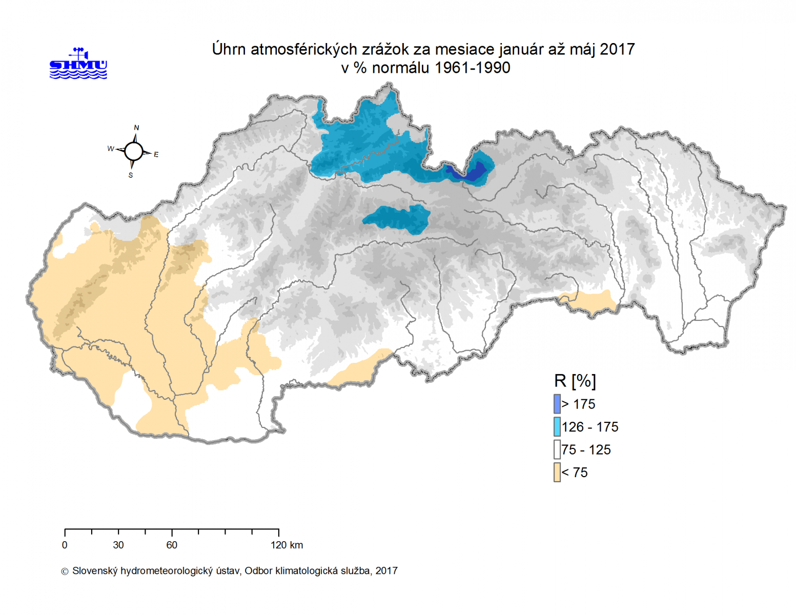 Aj napriek tomu, že atmosférické zrážky sa v priebehu mája vyskytovali pomerne pravidelne (predovšetkým vo forme prehánok a búrok), uplynulý mesiac ako celok bol zrážkovo podpriemerný (83 % dlhodobého priemeru 1901-2000). Najmenej pršalo na západnom Slovensku (37 %; 25 mm), kde zrážkový deficit dosiahol až -42 mm. Máj 2017 tak prispel k zvýšeniu kumulatívneho vlahového deficitu, ktorý dosiahol ku koncu mája 2017 v niektorých oblastiach na krajnom juhozápade takmer 130 mm (napr. oblasť Bratislavy; Obr. 7). Najviac zrážok v priebehu mája spadlo v oblasti Tatranskej Javoriny (155 mm; 140 % normálu 1961-1990).