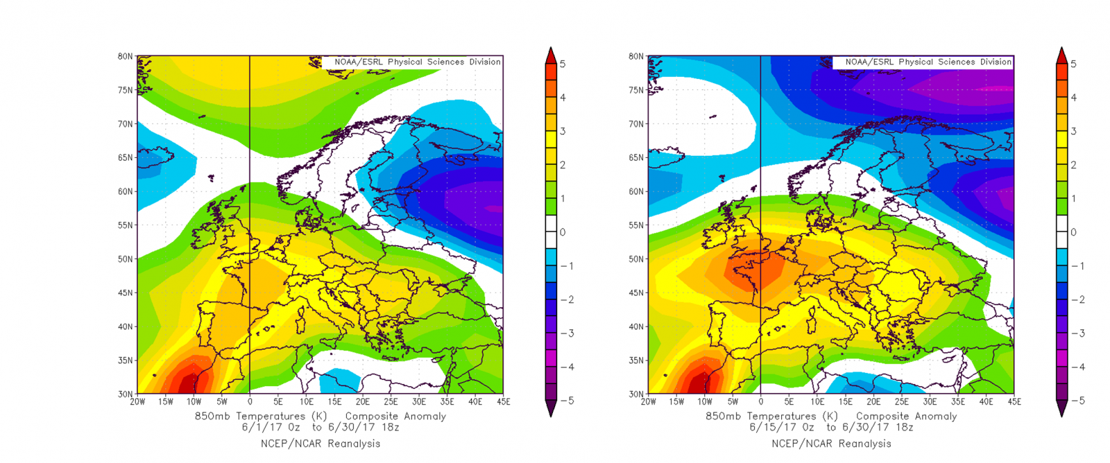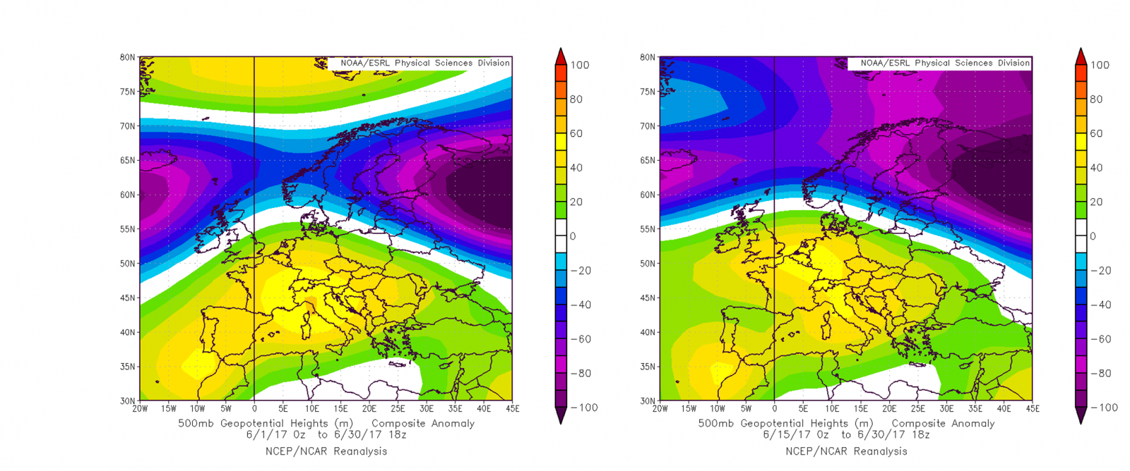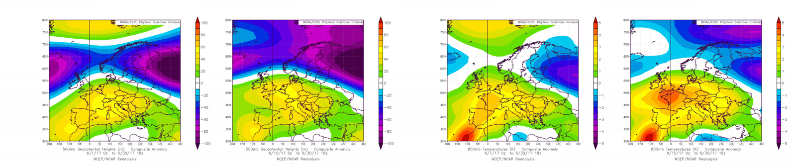 Obr. 5: Odchýlka priemernej výšky geopotenciálnej hladiny 500 hPa od dlhodobého priemeru v období od 1. 6., resp. 15. 6. 2017 do 30. 6. 2017 (vľavo); odchýlka teploty vzduchu na hladine 850 hPa v tom istom období od dlhodobého priemeru (vpravo); na základe údajov reanalýz NCEP/NCAR [Obr. 5a-b, Obr. 5c-d]