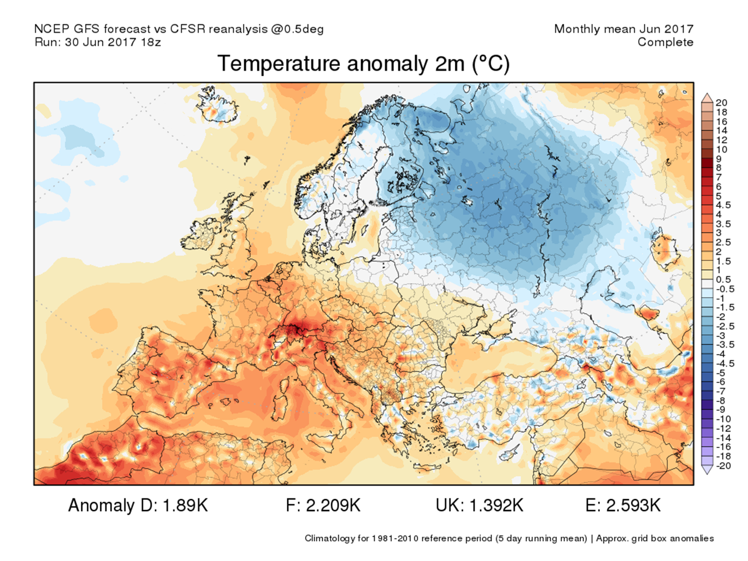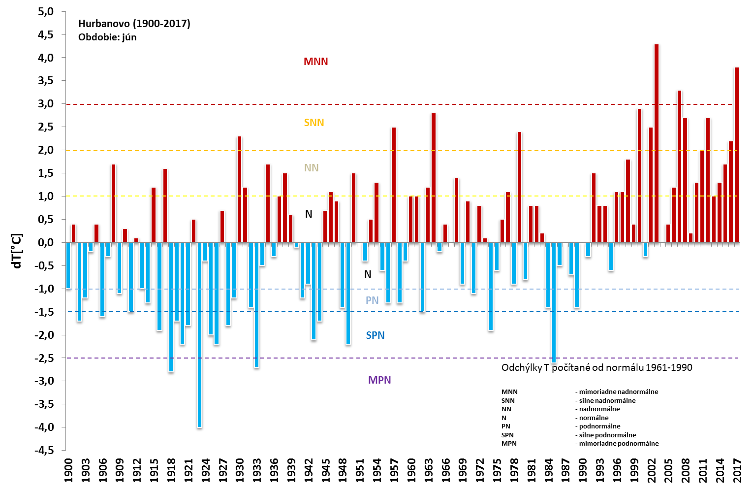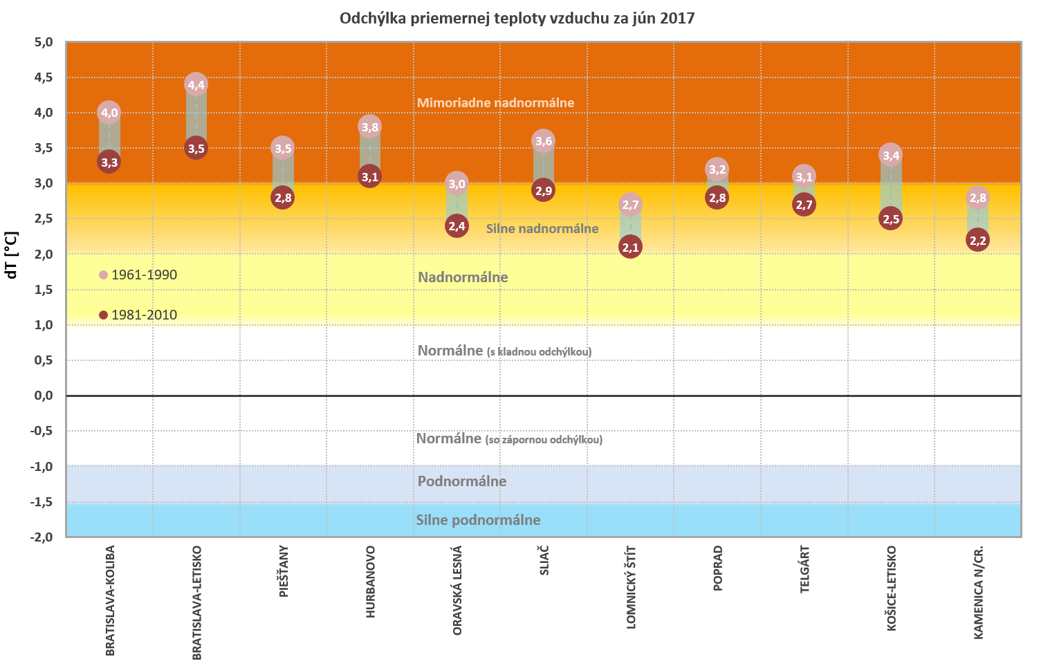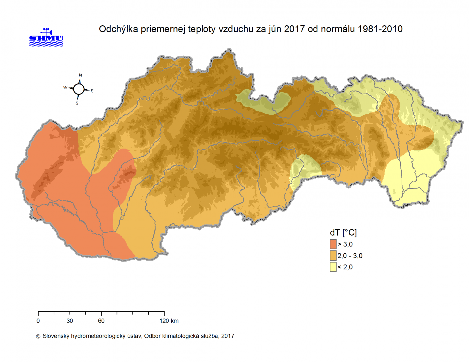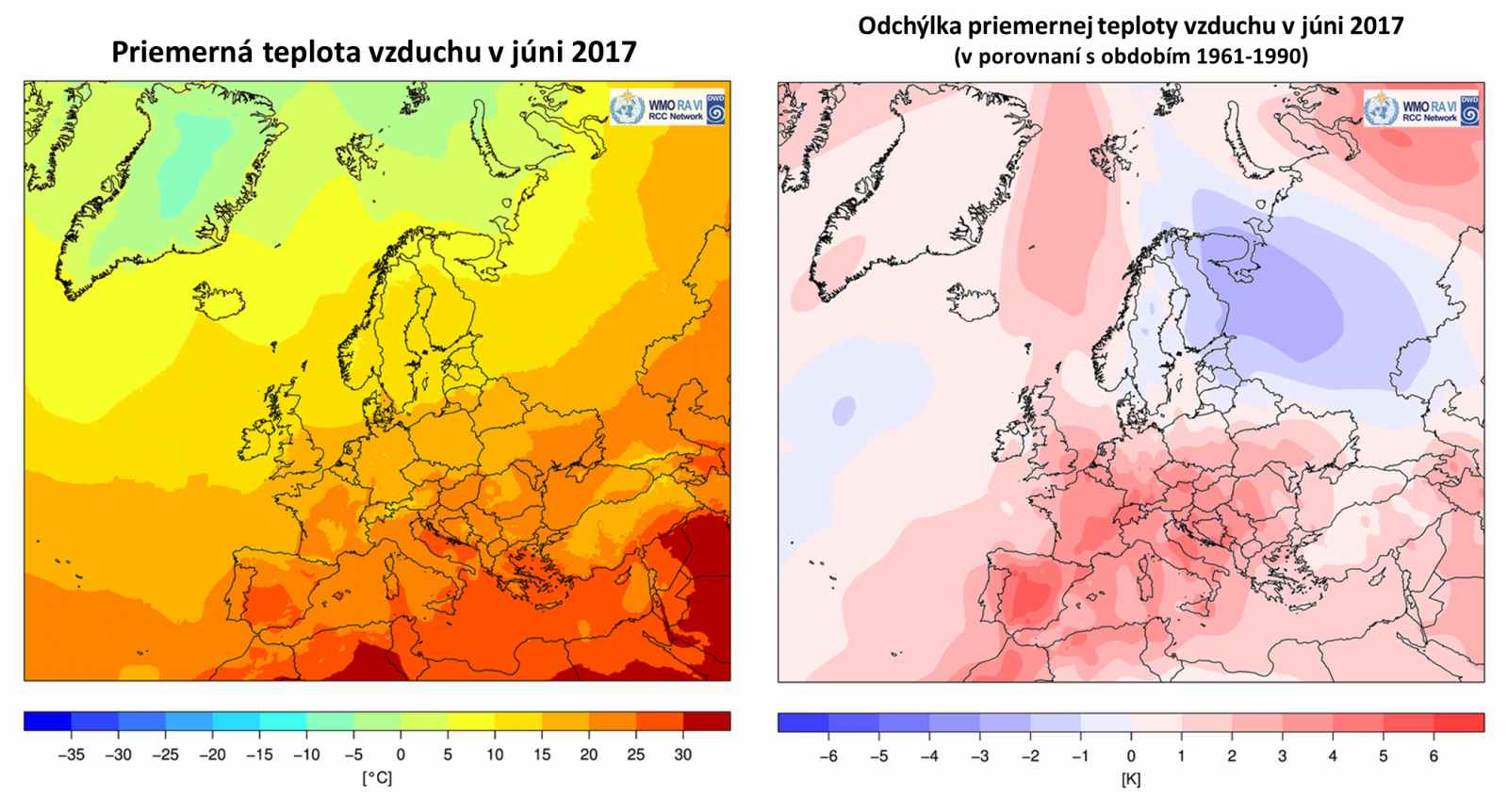 Jún 2017 bol na Slovensku historicky druhý najteplejší aspoň od roku 1951 (v Hurbanove aspoň od roku 1900), teplejšie bolo len v roku 2003. Vzhľadom na nedostatok atmosférických zrážok, ďalším významným rysom uplynulého mesiaca bol pokračujúci a prehlbujúci sa vlahový (zrážkový) deficit na západnom a juhozápadnom Slovensku. Veľmi teplý jún bol zaznamenaný aj v prevažnej časti Európy (s výnimkou severnej a východnej časti kontinentu), pričom v niektorých regiónoch Francúzska, Švajčiarska, Talianska a Balkánu dosiahla odchýlka priemernej júnovej teploty aj viac ako +4,0 °C, v Španielsku dokonca viac ako +5,0 °C (od normálu 1961-1990; porovnanie s normálom 1981-2010 je k dispozícii tu). Podľa predbežných údajov americkej NASA bol jún 2017 globálne štvrtý najteplejší aspoň od roku 1880, podľa japonskej JMA tretí najteplejší aspoň od roku 1891. WMO vo svojej mesačnej správe hodnotí výskyt viacerých pozoruhodných klimatických anomálii, vrátane významnej vlny horúčav, ktorá v priebehu júna zasiahla niekoľko krajín západnej a juhozápadnej Európy a v druhej polovici mesiaca aj Slovensko (operatívne hodnotenie NOAA). Naopak, relatívne chladnejší a zrážkovo významne nadnormálny jún (v dôsledku prevládajúceho cyklonálneho charakteru počasia) bol pozorovaný v európskej časti Ruska.