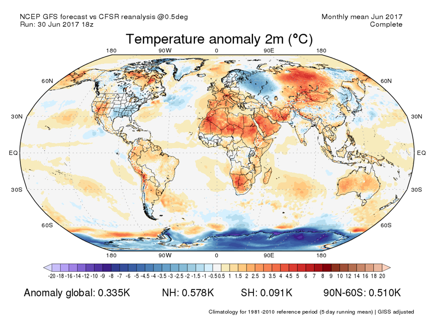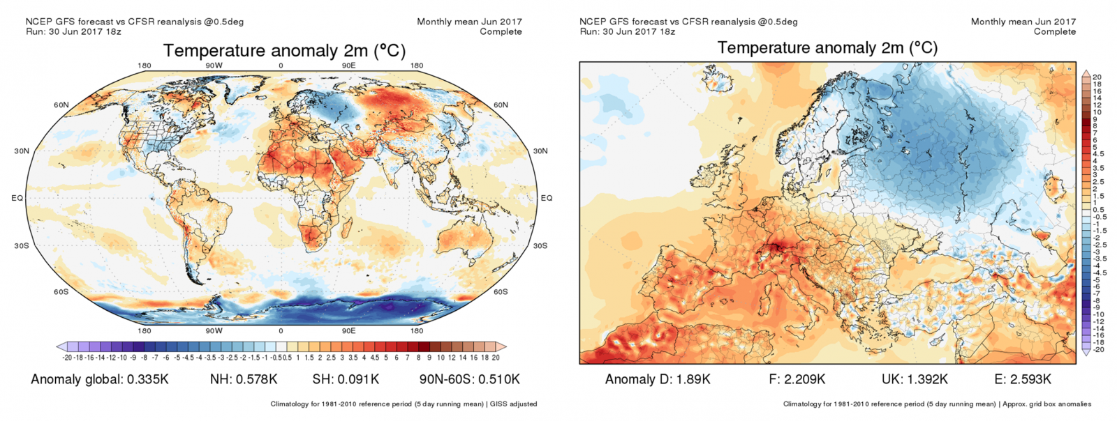 Obr. 7: Odchýlka priemernej mesačnej teploty vzduchu vo svete (vľavo) a v Európe (vpravo) v júni 2017 v porovnaní s normálom 1981-2010, podľa reanalýzy NCEP [Obr. 7a, Obr. 7b]