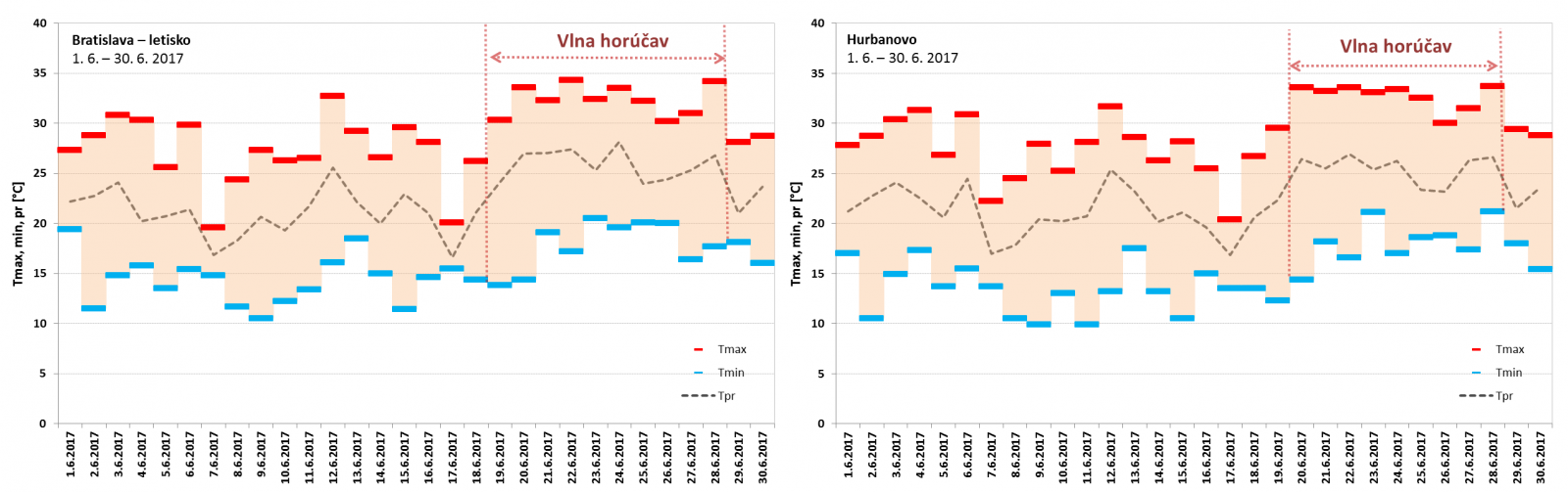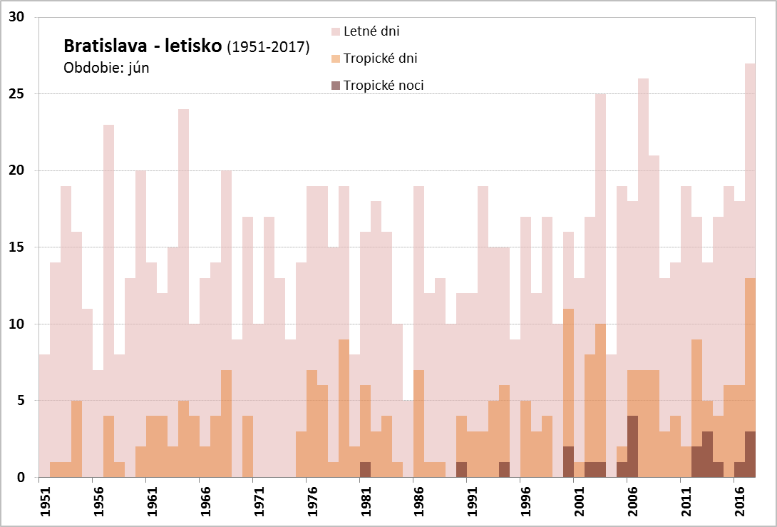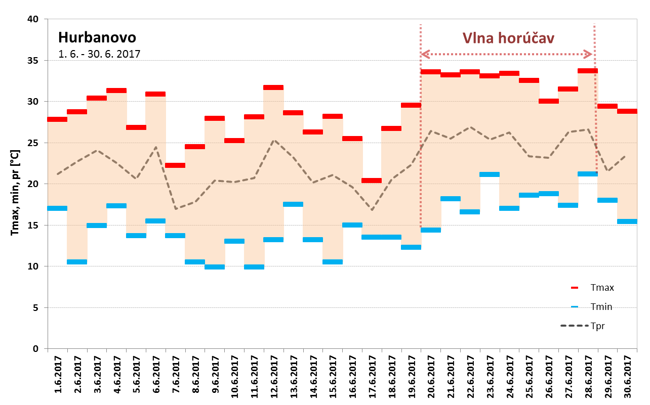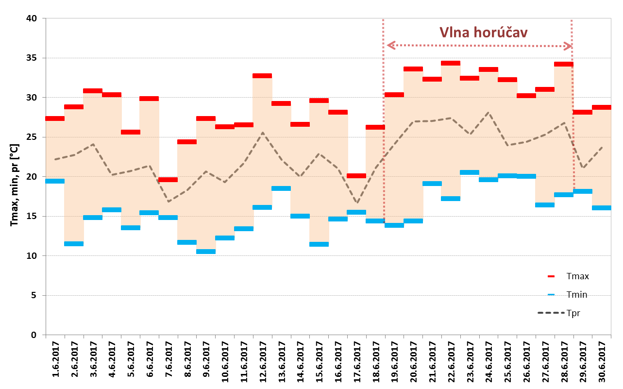 Vlna horúčav v júni 2017 trvala na Slovensku od 19. 6. do 30. 6. (Obr. 3). Najdlhšie trvanie mala na juhozápadnom Slovensku (stanice Bratislava – letisko, Slovenský Grob, Blahová, Žihárec, Moravský Svätý Ján, Kamenica nad Hronom, Mužla, Gbelce, Sládkovičovo, Horné Lefantovce), a to od 19. 6. do 28. 6., čo predstavuje 10 dní, a na stanici Podhájska od 20. 6. do 29. 6., tiež 10 dní. Najvyššia teplota vzduchu, 35,7 °C, bola počas tejto vlny horúčav nameraná dňa 28. 6. 2017 na stanici Topoľčany. Najvyšší priemer maximálnych denných teplôt bol na staniciach Hurbanovo, Mužla, Gbelce, Kamenica nad Hronom, Blahová a Slovenský Grob, a to 31,9 °C. Vlna horúčav vyvrcholila dňa 28. 6. 2017, kedy sme okrem vysokých denných teplôt vzduchu (33-35 °C) zaznamenali na pomerne veľkom počte staníc na západe a juhozápade Slovenska tropickú noc. Vlna horúčav skončila 30. 6., kedy bolo najteplejšie na juhovýchodnom Slovensku (Vysoká nad Uhom 30,0 °C, Michaľany 30,3 °C).