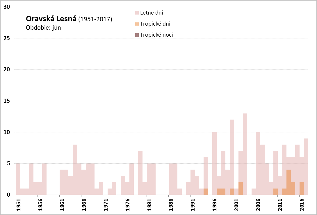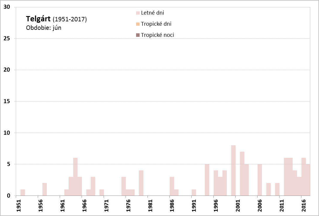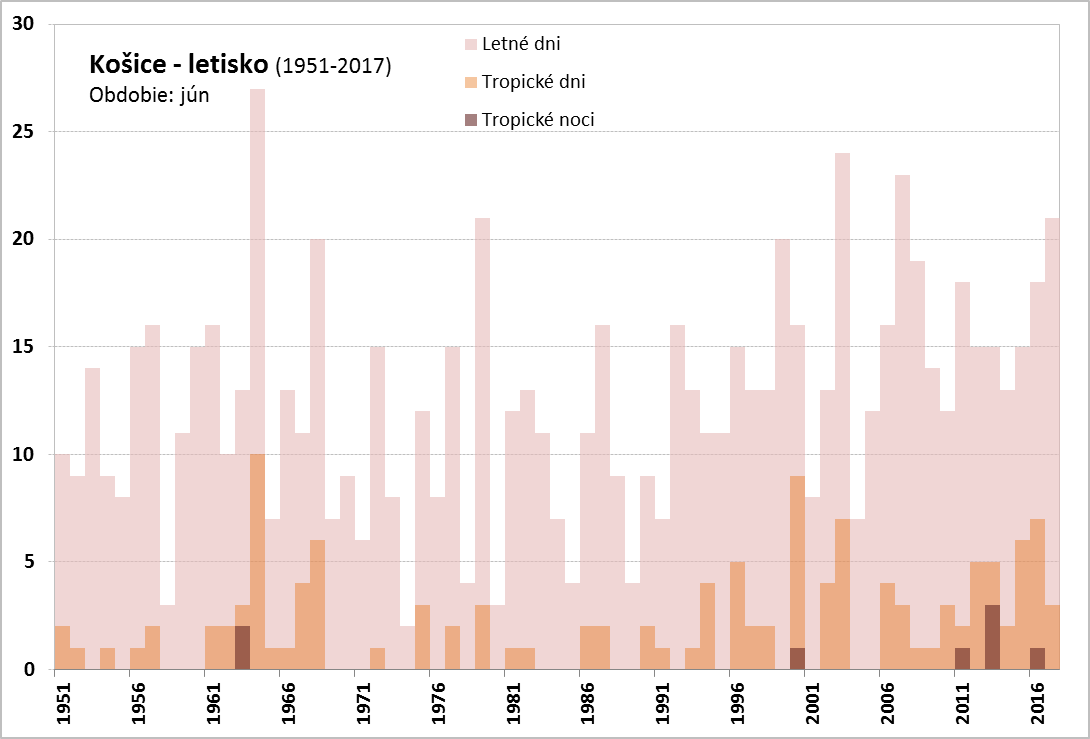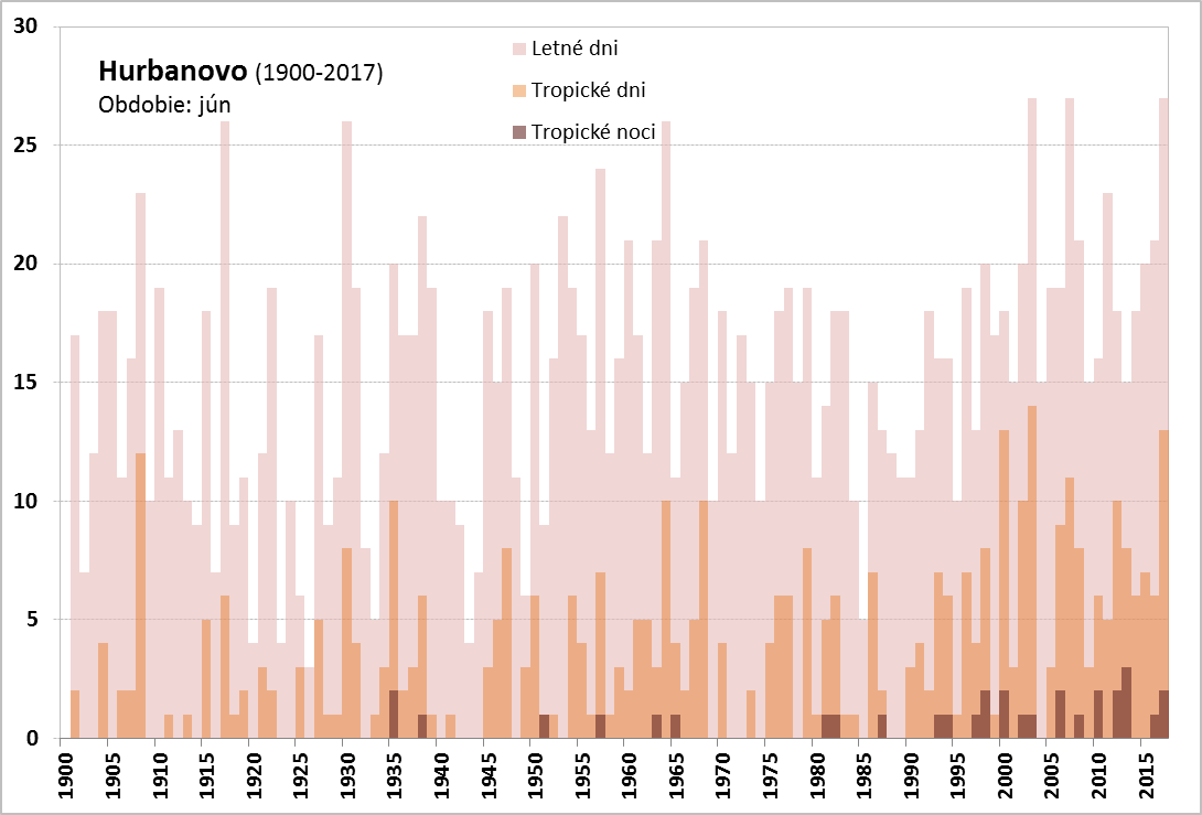 Vlna horúčav v júni 2017 trvala na Slovensku od 19. 6. do 30. 6. (Obr. 3). Najdlhšie trvanie mala na juhozápadnom Slovensku (stanice Bratislava – letisko, Slovenský Grob, Blahová, Žihárec, Moravský Svätý Ján, Kamenica nad Hronom, Mužla, Gbelce, Sládkovičovo, Horné Lefantovce), a to od 19. 6. do 28. 6., čo predstavuje 10 dní, a na stanici Podhájska od 20. 6. do 29. 6., tiež 10 dní. Najvyššia teplota vzduchu, 35,7 °C, bola počas tejto vlny horúčav nameraná dňa 28. 6. 2017 na stanici Topoľčany. Najvyšší priemer maximálnych denných teplôt bol na staniciach Hurbanovo, Mužla, Gbelce, Kamenica nad Hronom, Blahová a Slovenský Grob, a to 31,9 °C. Vlna horúčav vyvrcholila dňa 28. 6. 2017, kedy sme okrem vysokých denných teplôt vzduchu (33-35 °C) zaznamenali na pomerne veľkom počte staníc na západe a juhozápade Slovenska tropickú noc. Vlna horúčav skončila 30. 6., kedy bolo najteplejšie na juhovýchodnom Slovensku (Vysoká nad Uhom 30,0 °C, Michaľany 30,3 °C).