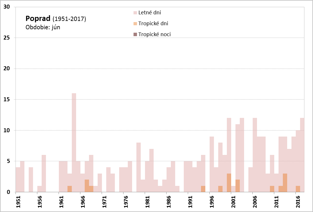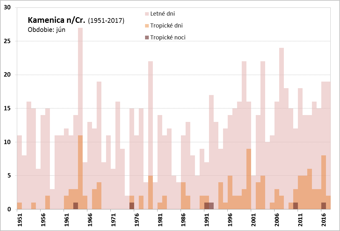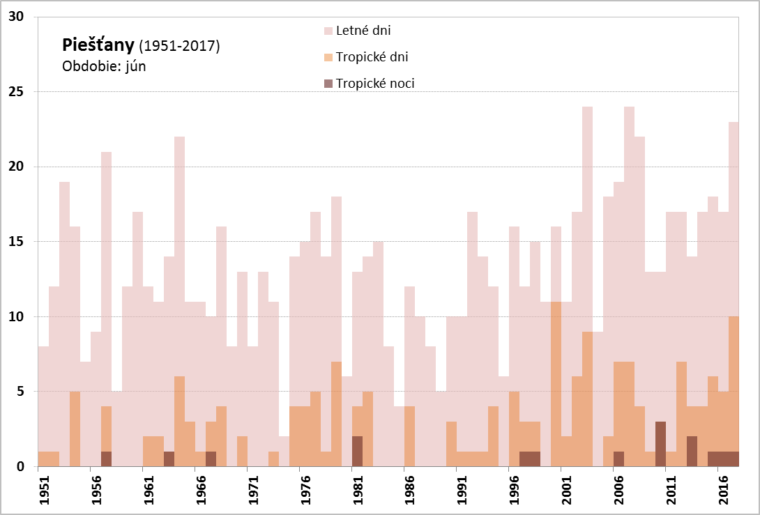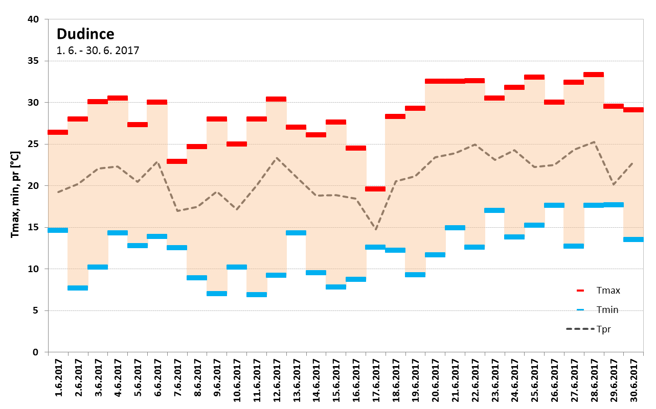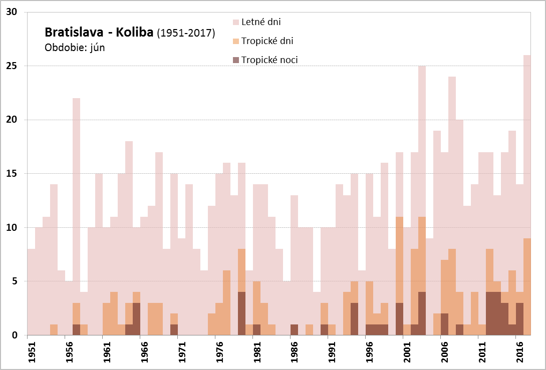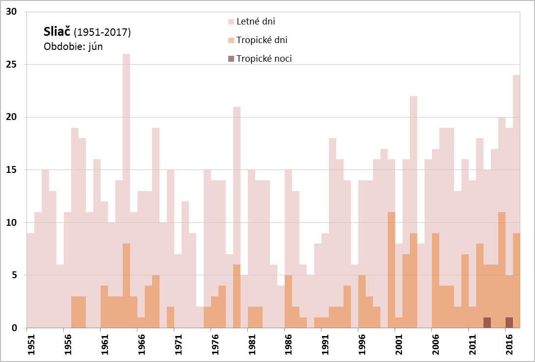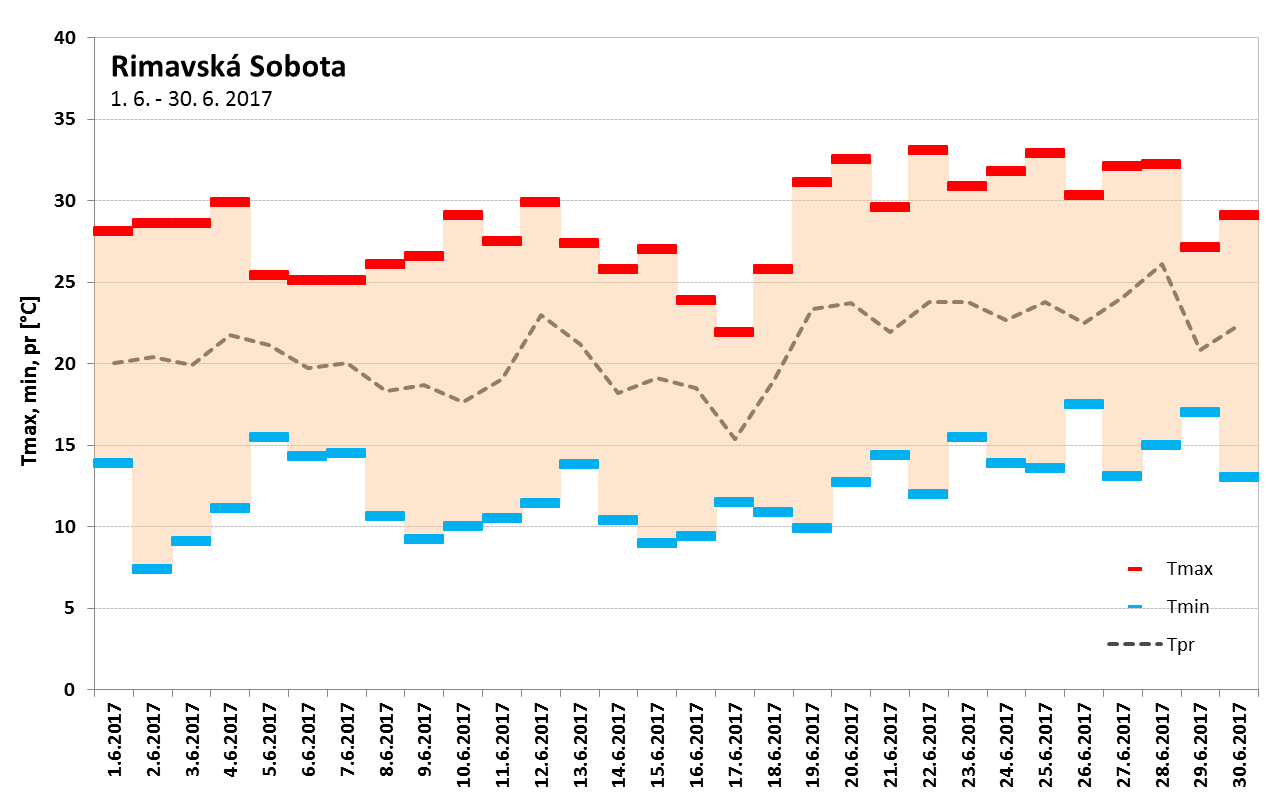Absolútne teplotné minimum, okrem vysokých horských polôh (Lomnický štít, -3,5 °C dňa 14. 6. a Chopok, -0,7 °C dňa 8. 6.), bolo zaznamenané v Červenom Kláštore (0,9 °C, dňa 2. 6.), najvyššie maximum v Topoľčanoch (35,7 °C, dňa 28. 6.). V priebehu júna sme zaznamenali významne nadnormálny počet letných a tropických dní. [Spracovanie mesačného počtu letných a tropických dní, a tropických nocí za jún pre vybrané stanice na Slovensku v období (1900)1951-2017: Bratislava-Koliba, Bratislava-letisko, Piešťany, Hurbanovo, Oravská Lesná, Sliač, Poprad, Telgárt, Košice-letisko a Kamenica n/Cr.] Na staniciach Bratislava-Koliba (26 dní) a Bratislava-letisko (27 dní) bol mesačný počet letných dní (pre BA-letisko to platí aj v prípade tropických dní) v júni 2017 najvyšší aspoň od roku 1951. V Hurbanove bolo v júni zaznamenaných 27 letných dní, čo je spolu s rokom 2003 a 2007 vôbec najvyšší počet aspoň od roku 1900.