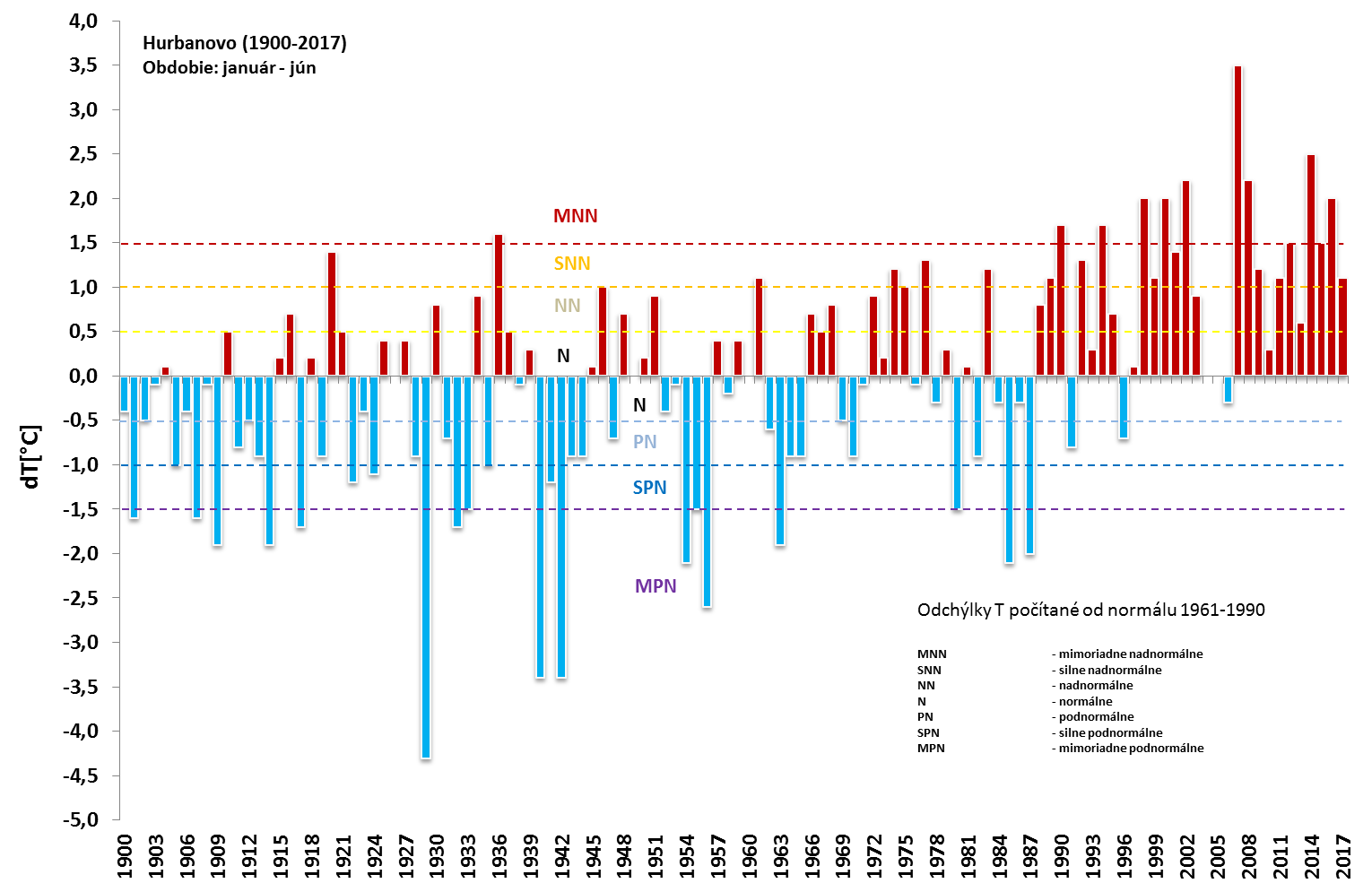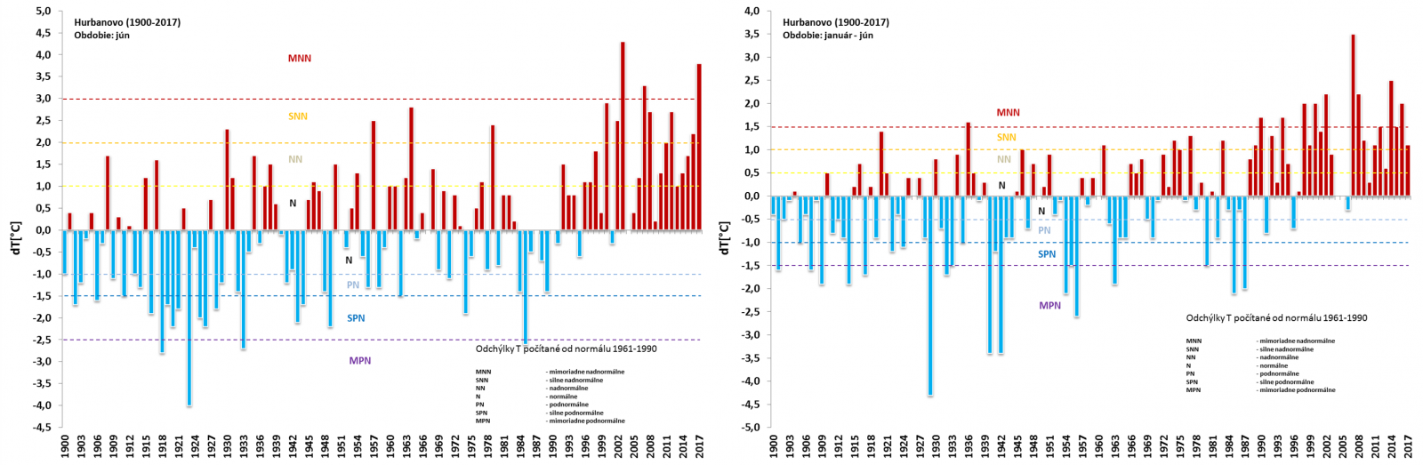Obr. 2: Odchýlka priemernej mesačnej teploty vzduchu v júni (vľavo) a za obdobie január až jún (vpravo) v Hurbanove v období 1900-2017 (v porovnaní s normálom 1961-1990) [Obr. 2a, Obr. 2b]