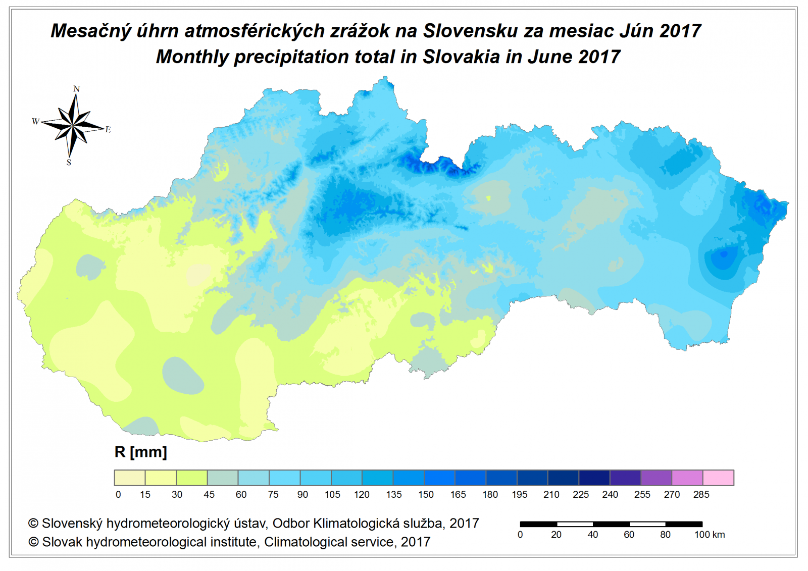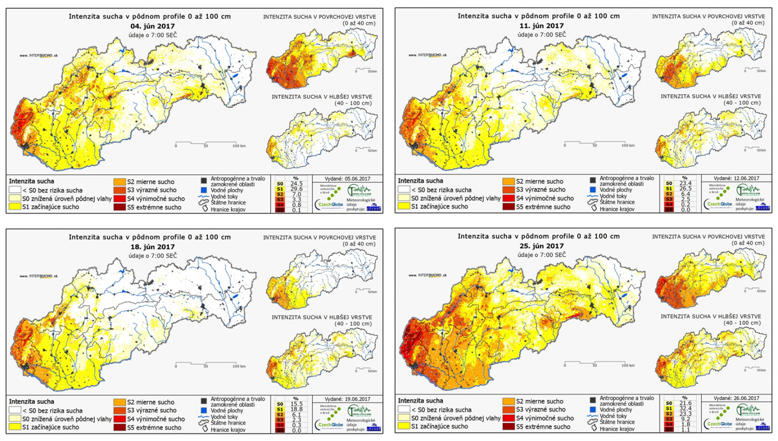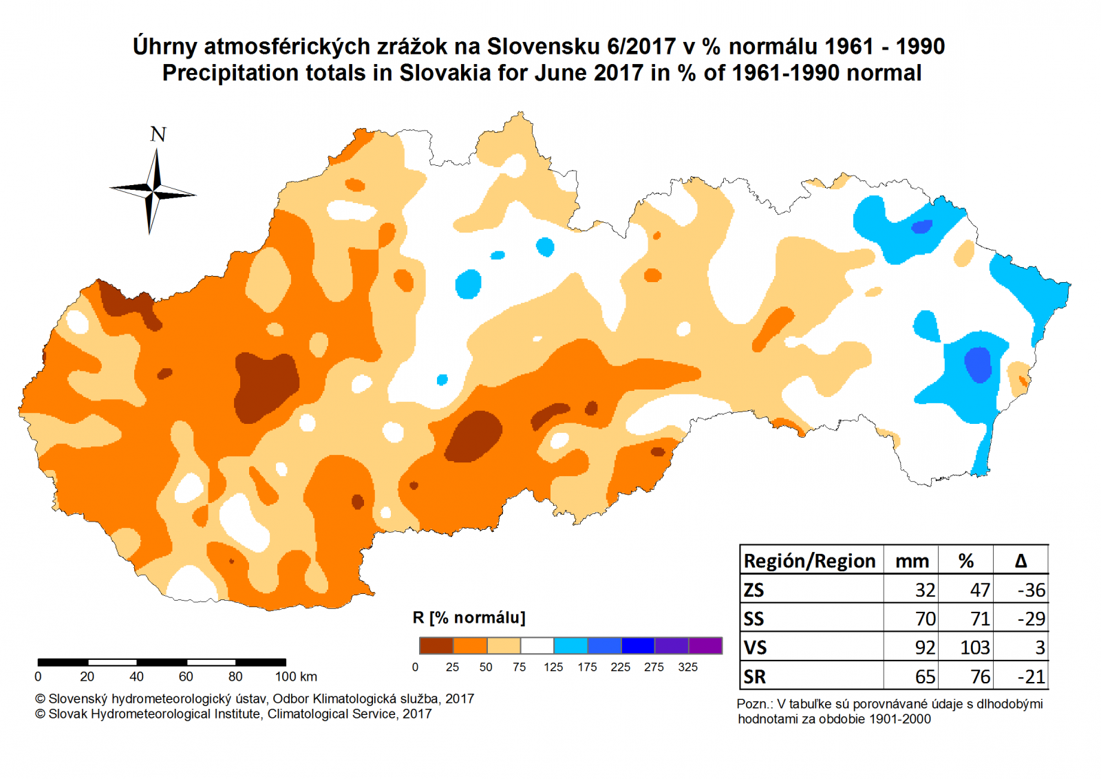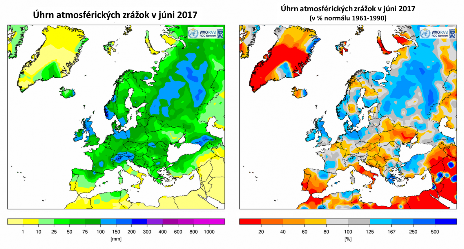 Jún 2017 bol z hľadiska množstva atmosférických zrážok podpriemerný mesiac (76 % dlhodobého priemeru 1901-2000; 65 mm), priestorové rozloženie zrážok bolo vzhľadom na častý výskyt prehánok a búrok pomerne nerovnomerné. Na západnom Slovensku skončil jún 2017 ako veľmi suchý (47 %; 32 mm), s čím súvislo aj pokračujúce prehlbovanie vlahového (zrážkového) deficitu (napr. Bratislava-letisko: -170 mm k 30. 6. 2017) a pôdneho sucha. [Podrobnejšia analýza podmienok meteorologického sucha a vlahového deficitu.] Slovensko však nebolo jedinou krajinou, kde boli pozorované v priebehu júna úhrny zrážok pod dlhodobým priemerom. Relatívne menej pršalo aj v susednom Maďarsku, na väčšine územia Balkánu, ďalej v Taliansku, Španielsku, Portugalsku, ale napríklad aj na Ukrajine či v Belgicku.