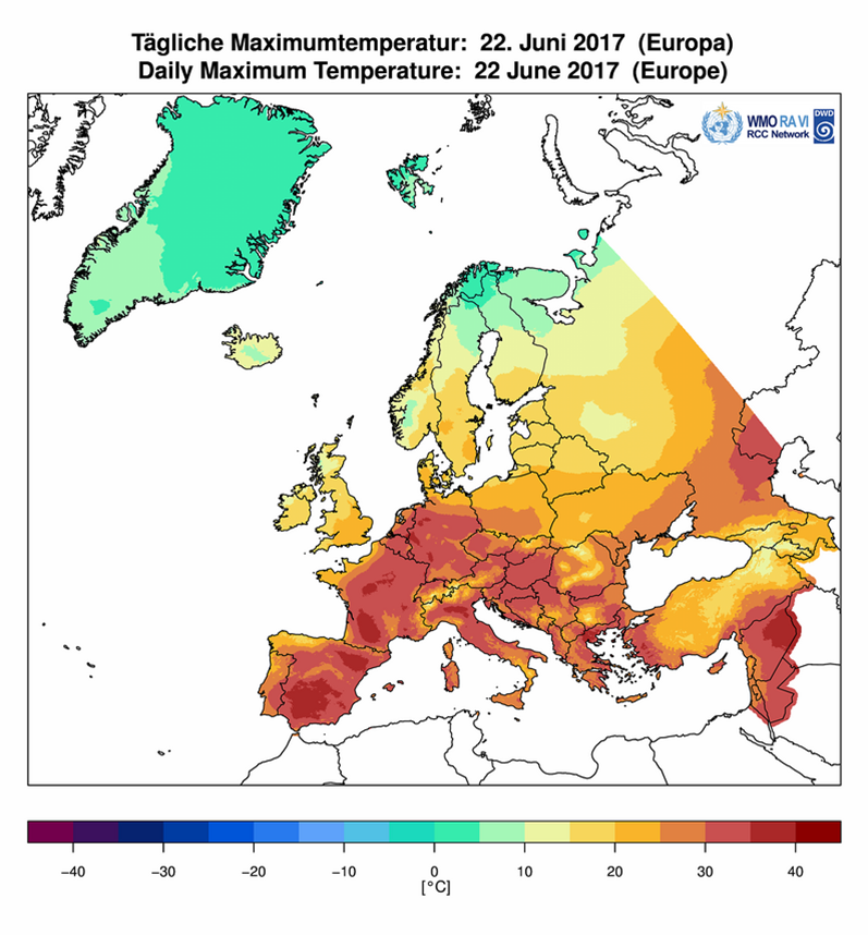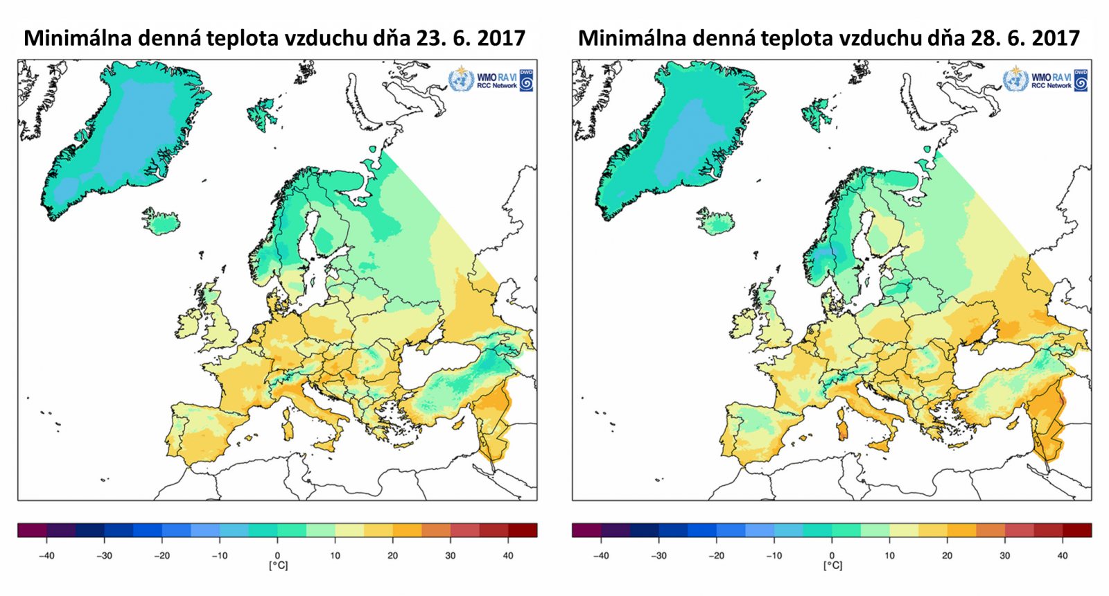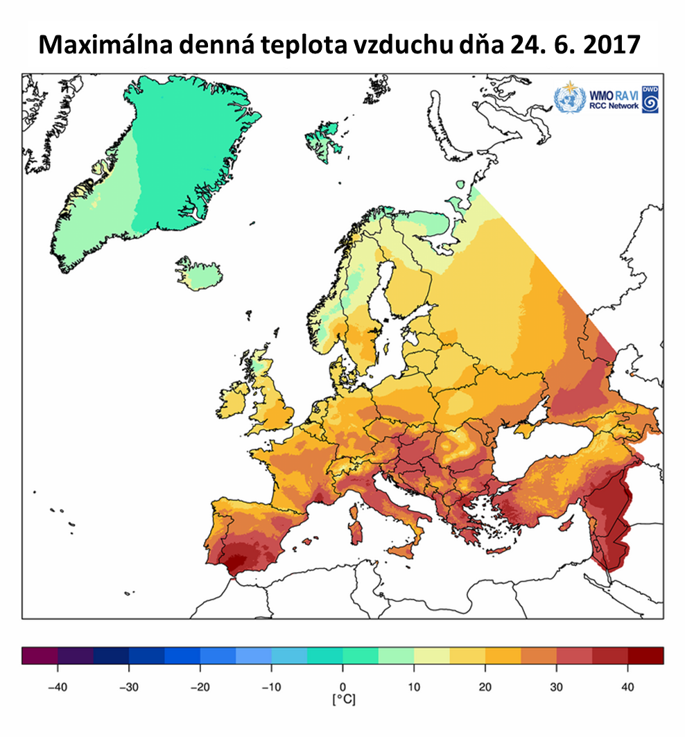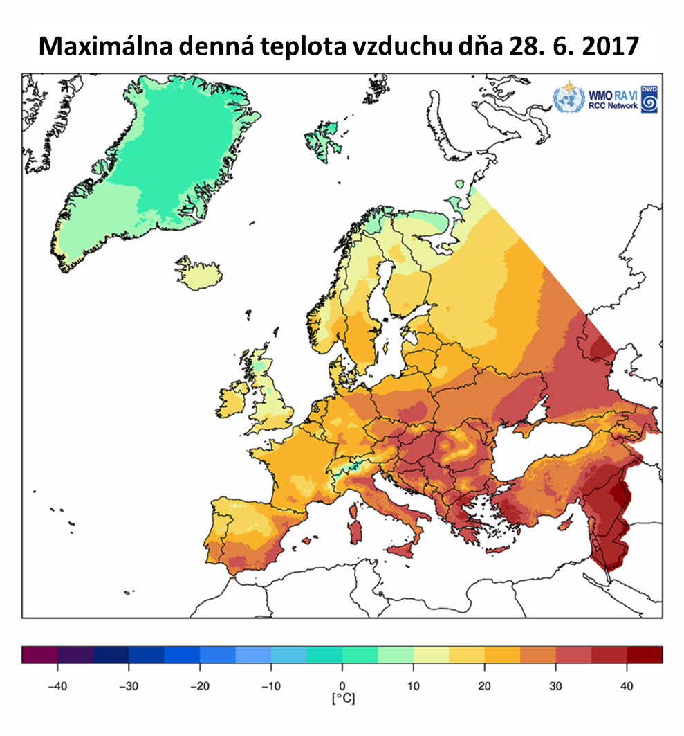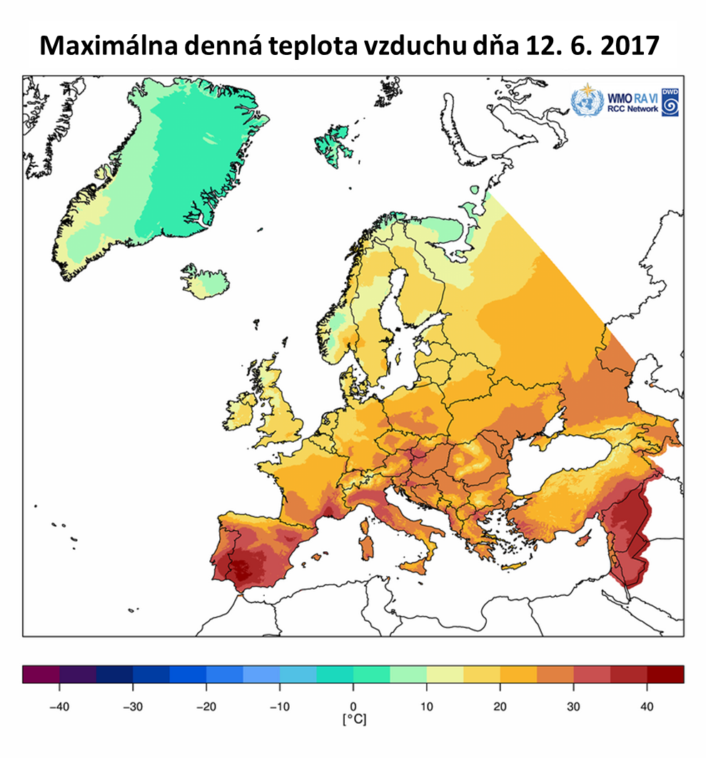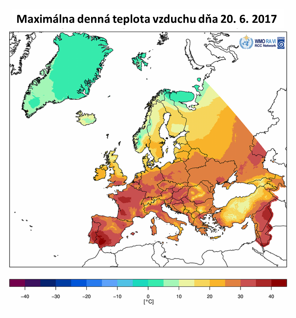 Na Obr. 4 je zobrazená maximálna denná teplota vzduchu v Európe vo vybraných dňoch od 12. 6. do 28. 6. 2017 (na základe údajov WMO). [Minimálna denná teplota vzduchu v Európe v dňoch 23. a 28. 6. 2017.] Časový vývoj zachytáva postupnú propagáciu vlny horúčav z juhozápadnej a západnej Európy smerom na východ. Príčinu vzniku vlny veľmi vysokých teplôt vzduchu možno vidieť predovšetkým v cirkulačných podmienkach, ktoré boli spojené s vytvorením stabilnej a dlhodobo perzistentnej tlakovej výše nad (juho)západnou a strednou Európou. Na Obr. 5 vpravo možno vidieť rozloženie odchýlok priemernej teploty vzduchu na hladine 850 hPa, ktoré predovšetkým v období druhej polovice júna 2017 dosahovali významne vysoké hodnoty nad územím Francúzska a južnej Británie.