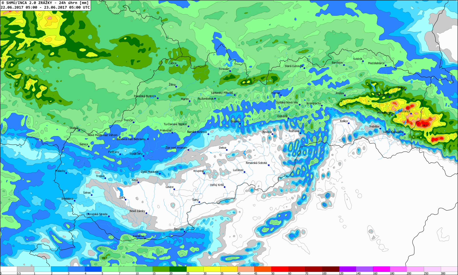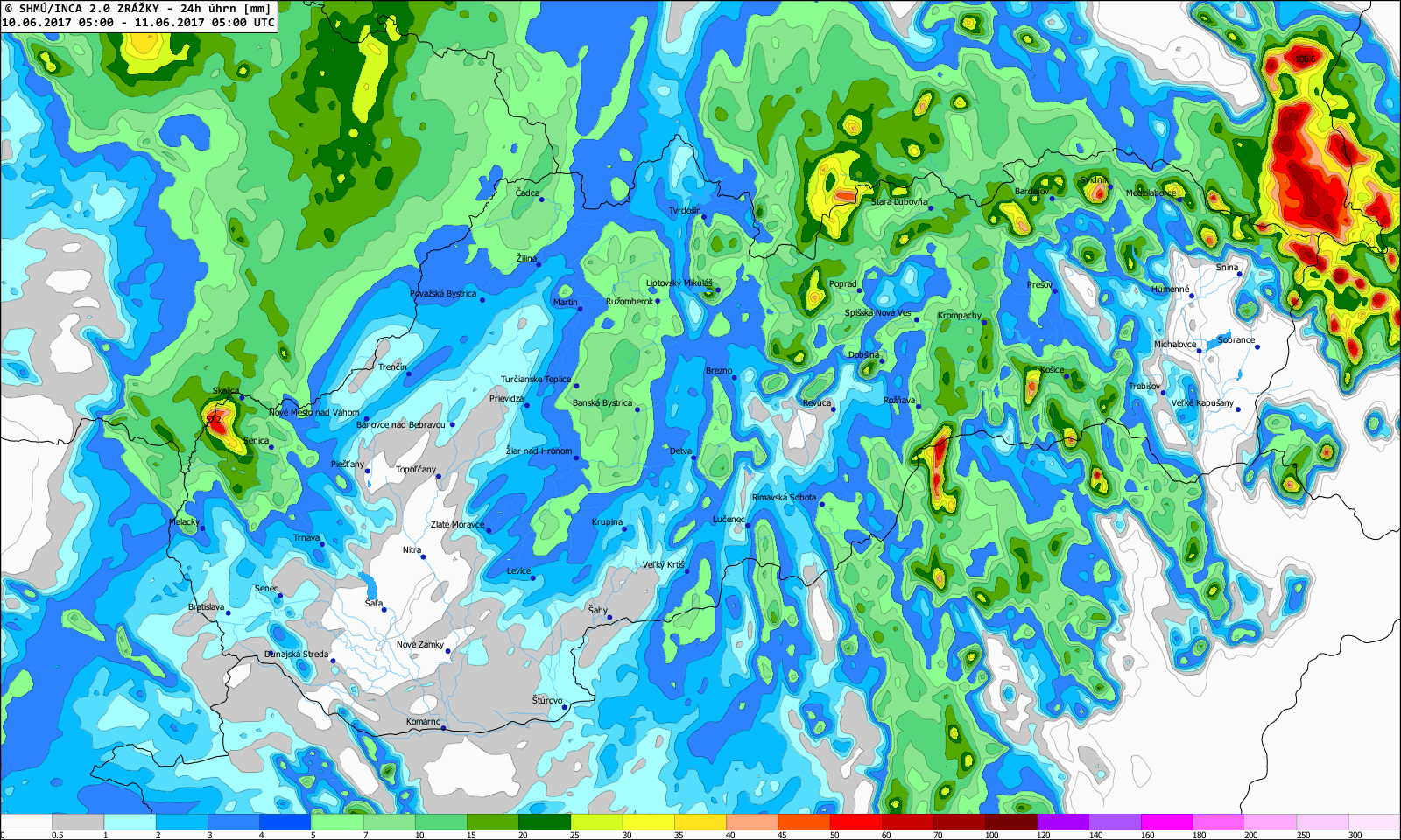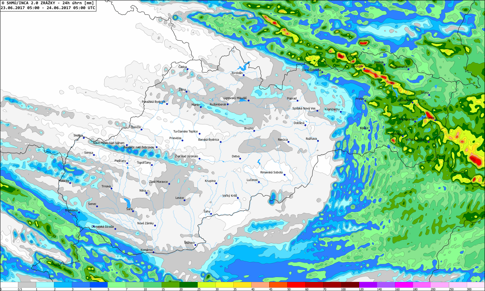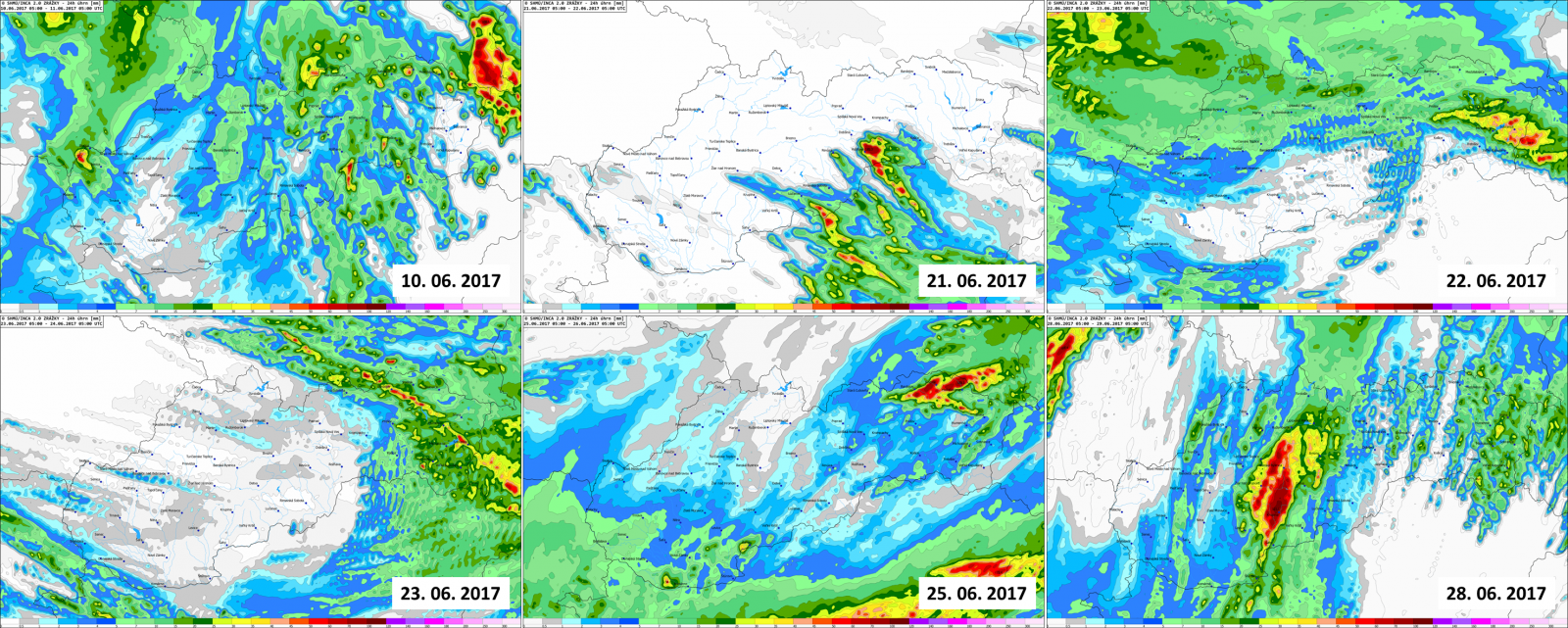 Zvlášť druhá polovica júna priniesla niekoľko zaujímavých situácií, kedy počas prehánok a búrok spadlo v relatívne krátkom čase veľké množstvo zrážok (v niektorých prípadoch aj viac ako 60 mm), a to najmä na strednom a východnom Slovensku (napr. 21., 22., 23., 25. a 28. 6. 2017, Obr. 6).