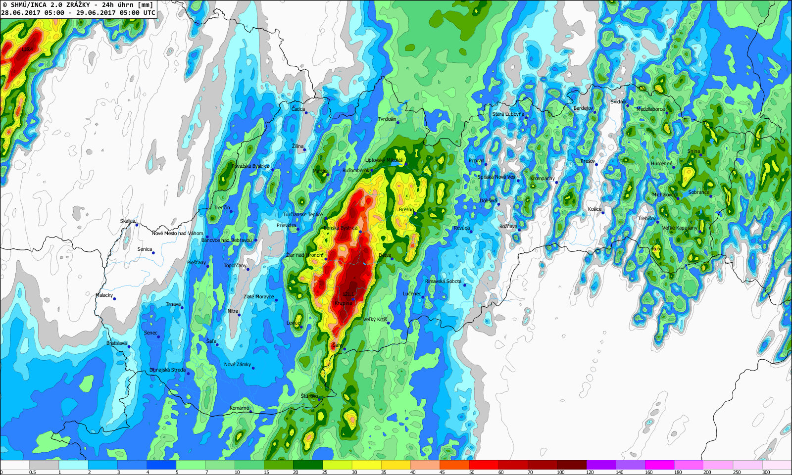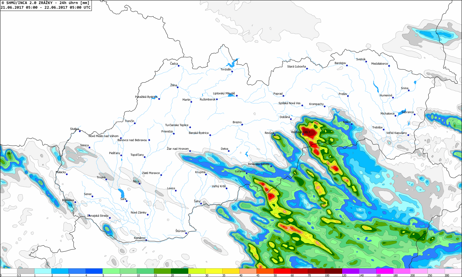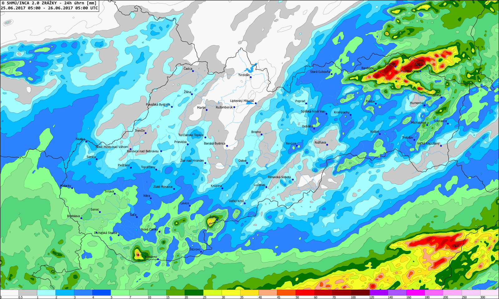 Zvlášť druhá polovica júna priniesla niekoľko zaujímavých situácií, kedy počas prehánok a búrok spadlo v relatívne krátkom čase veľké množstvo zrážok (v niektorých prípadoch aj viac ako 60 mm), a to najmä na strednom a východnom Slovensku (napr. 21., 22., 23., 25. a 28. 6. 2017, Obr. 6).