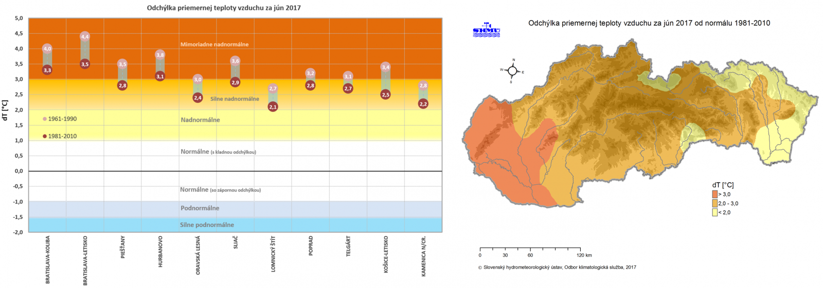 Obr. 1: (vľavo) Odchýlka priemernej mesačnej teploty vzduchu v júni 2017 od normálu 1961-1990 a 1981-2010 na vybraných meteorologických staniciach; (vpravo) priestorové rozloženie odchýlky priemernej mesačnej teploty vzduchu na Slovensku v júni 2017 od normálu 1981-2010 [Obr. 1a, Obr. 1b]