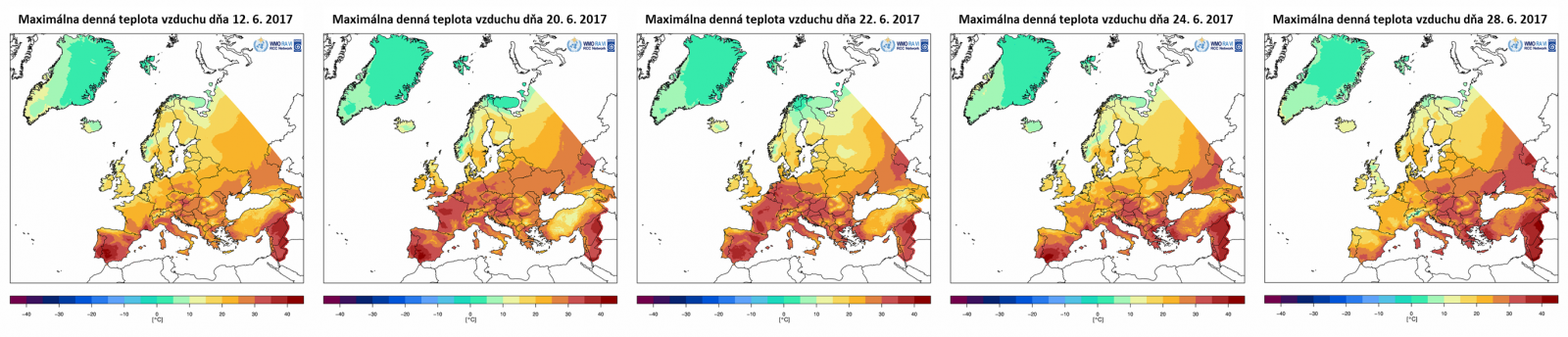 Obr. 4: Maximálna denná teplota vzduchu vo vybraných dňoch v období od 12. 6. do 28. 6. 2017 na základe údajov WMO/DWD [Obr. 4a, Obr. 4b, Obr. 4c, Obr. 4d, Obr. 4e]