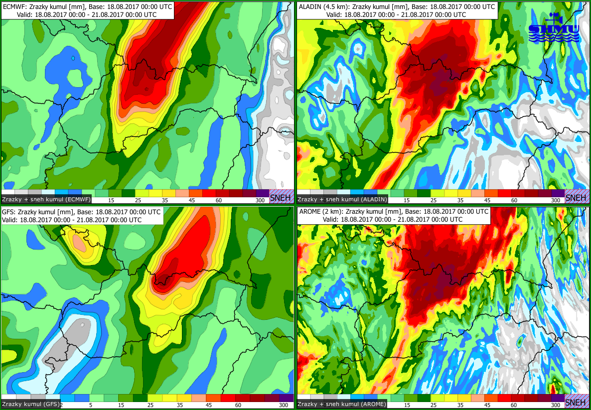 Predpokladaný kumulatívny úhrn zrážok do pondelka 21.8.2017, 00:00 UTC z viacerých modelov (globálne modely ECMWF a GFS, lokálne modely SHMÚ - ALADIN a AROME).
