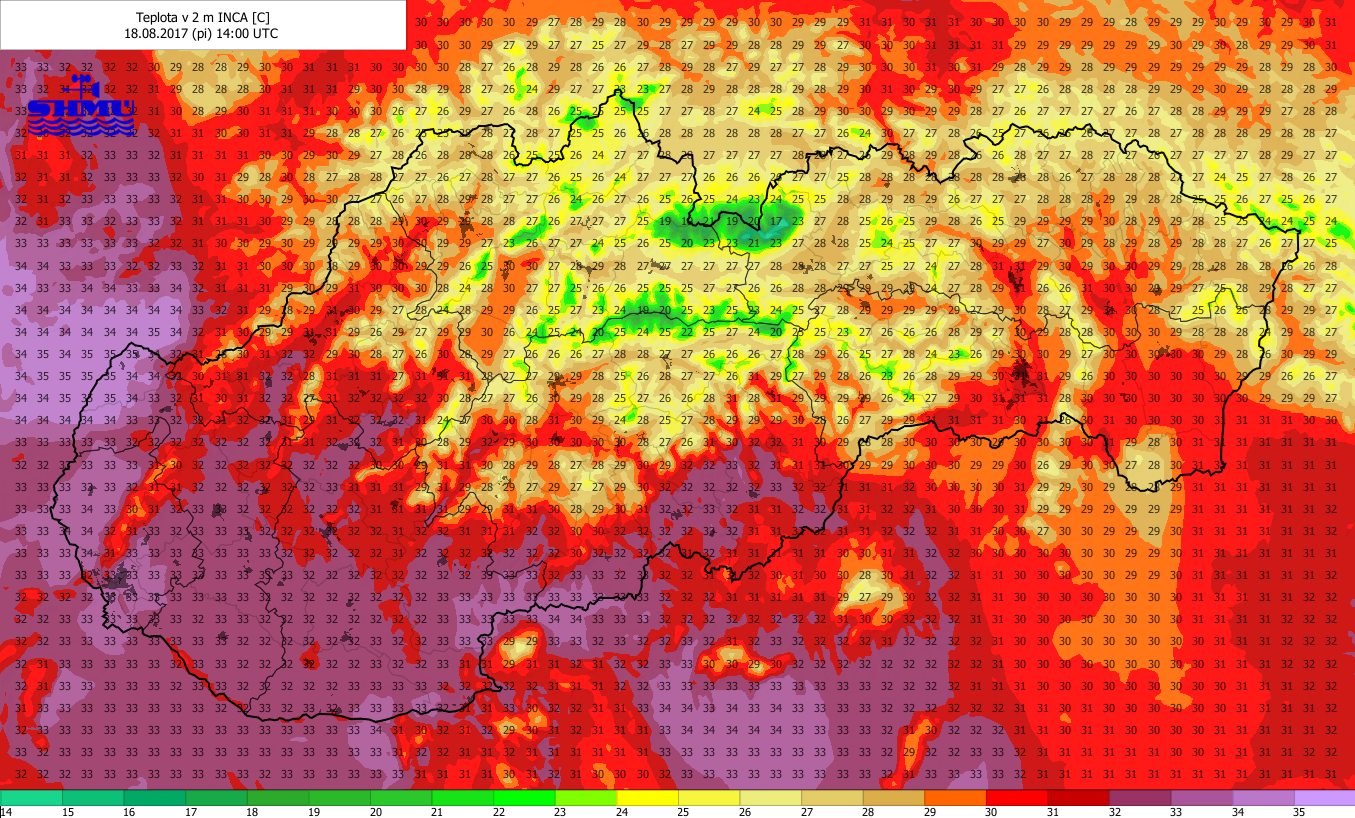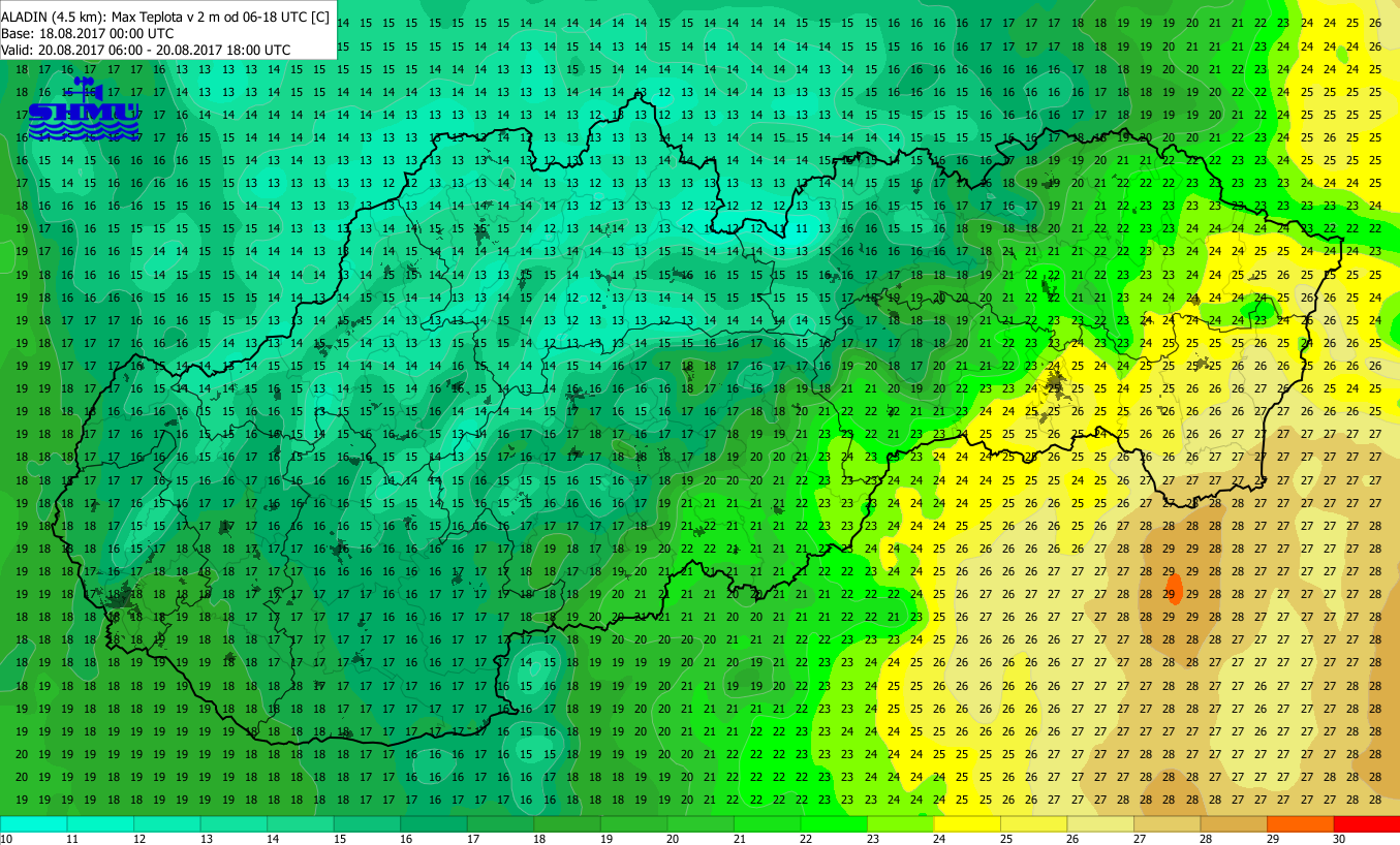 Obr. 3 - Predpoveď maximálnej teploty vzduchu vo výške 2 m nad povrchom ALADIN 20.8.2017.