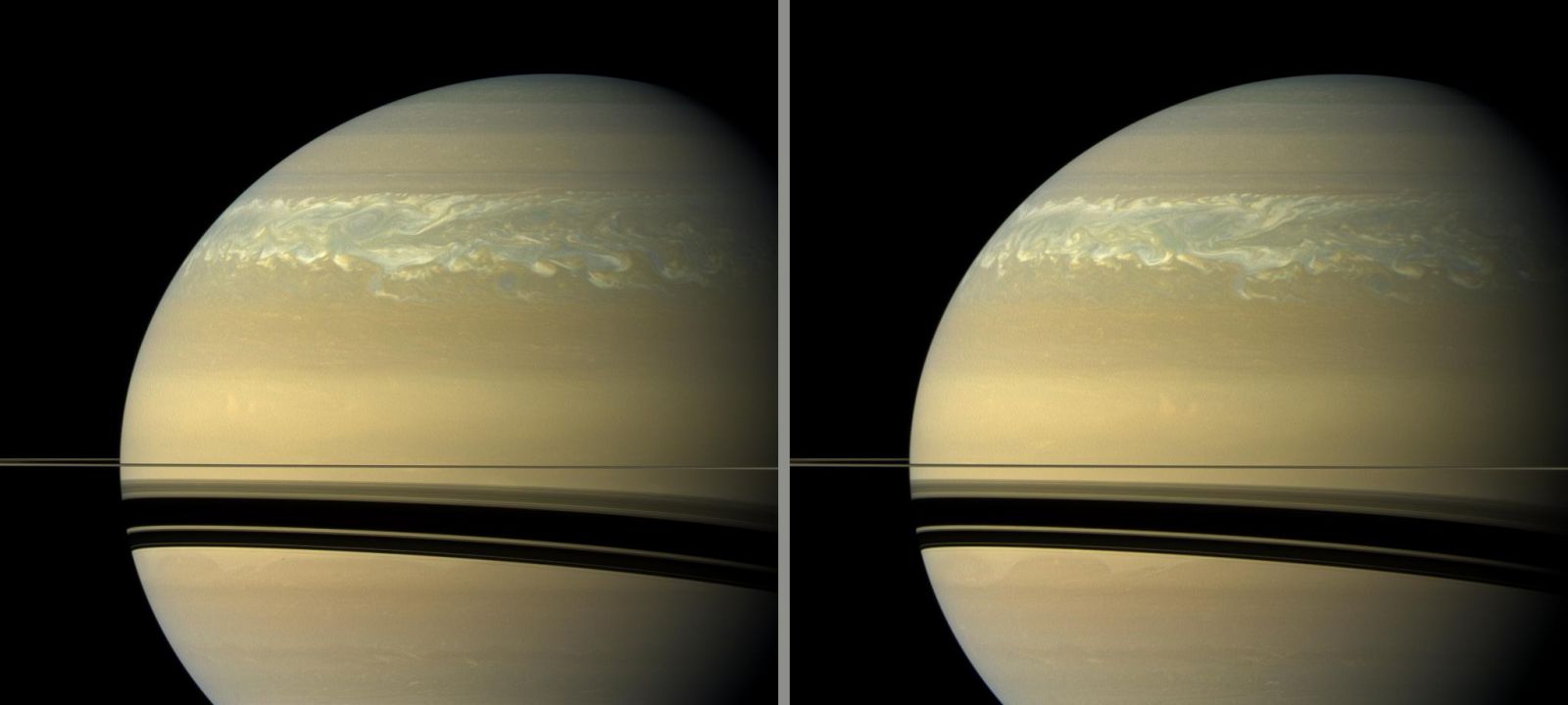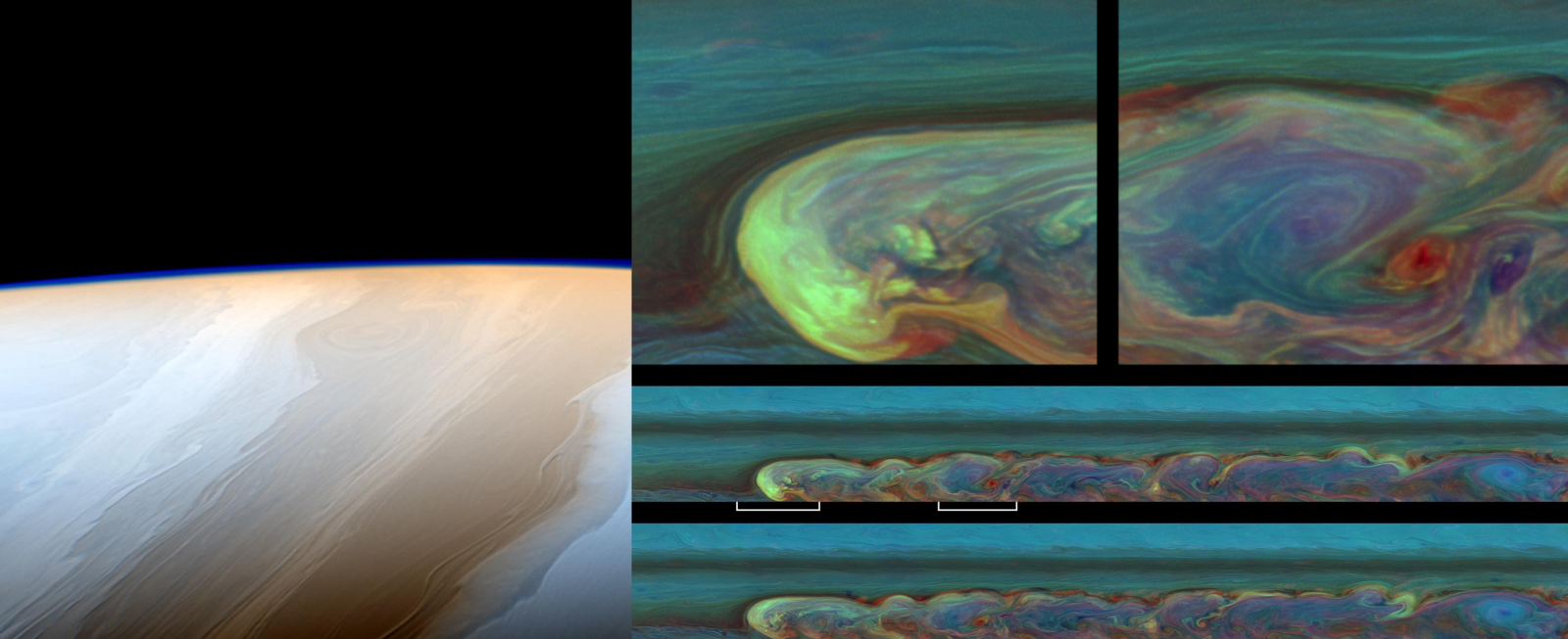 Obr. 14: (vľavo) Detailný pohľad na hornú hranicu oblačnosti atmosféry Saturna (Cassini NASA); (vpravo) detailný záber Dračej búrky v nepravých farbách [Zdroj: JPL NASA]