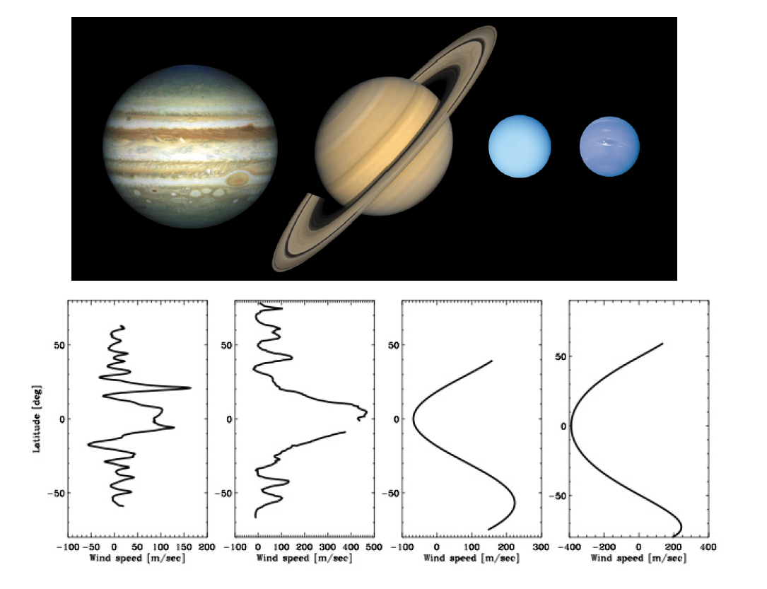 Zdajú sa Vám pozemské hurikány niekedy obrovské? Ak áno, potom skúste zacieliť svoje ďalekohľady na Jupiter. Jeho atmosférou sa rúti "búrka za búrkou" (z ang. storm), jedna väčšia ako druhá. A tie najväčšie, ako napríklad Veľká červená škvrna, jasne identifikovateľná v južnom tropickom pásme planéty, sú dokonca niekoľkonásobne väčšie ako Zem. Búrkové systémy na Jupiteri, a veľmi pravdepodobne aj na ďalších plynných planétach, sú podobne ako na Zemi poháňané silnou konvekciou (ide o organizované výstupné pohyby vzduchu v dôsledku existencie výrazného vertikálneho teplotného rozdielu medzi teplými spodnými a chladnými hornými vrstvami atmosféry), no vzhľadom na väčšiu rotáciu veľkých planét (Obr. 2) majú diametrálne odlišnú a dodnes nie celkom pochopenú dynamiku. Pozoruhodné je to, že na vonkajších planétach je vertikálny teplotný profil, ako aj veľkosť teplotného gradientu atmosfér takmer identický, čo sa dá vysvetliť len tým, že zdrojom ohrievania spodných vrstiev atmosfér nie je v tomto prípade Slnko, ako tomu je na Zemi, ale teplo unikajúce z útrob planét.