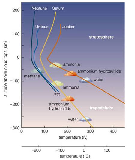 Na rozdiel od atmosfér vnútorných terestrických planét (Merkúr, Venuša, Zem a Mars) bohatých na ťažšie a zložitejšie chemické prvky a zlúčeniny, ako napríklad dusík, oxid uhličitý či kyslík, majú gigantické planéty (Jupiter, Saturn, Urán a Neptún, Obr. 1) atmosféry plné jednoduchých a prchavých plynov (vodík, hélium, metán, vodná para, atď.), ktoré pred miliardami rokov skondenzovali pod vplyvom silnejšej gravitácie do podoby veľmi aktívnych a dynamicky sa vyvíjajúcich plynno-kvapalinových obalov. Zatiaľ čo ale vnútorné planéty o všetky ľahšie plyny v dôsledku vyššej povrchovej teploty a slabšej gravitácie prišli ešte v počiatočných štádiách svojho vývoja a nahradili ich substanciami pochádzajúcimi predovšetkým z vulkanizmu, chemické zloženie atmosfér vonkajších planét veľmi pravdepodobne ostáva už niekoľko miliárd rokov bez podstatnejšej zmeny.