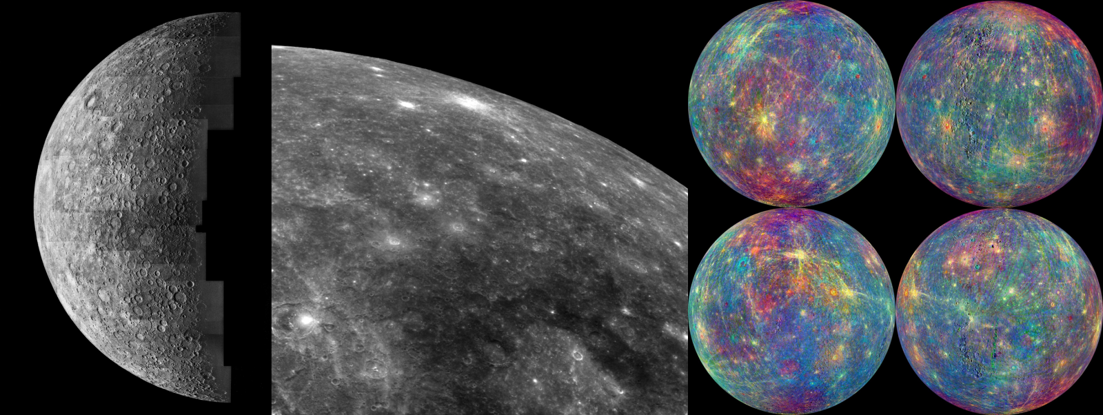 Obr. 3: Povrch planéty Merkúr zachytený sondou Mariner v roku 1974 (vľavo) a sondou Messenger v roku 2004 (v strede); vpravo je spektrálny záber povrchu vytvorený pomocou MASCS spektrometra mapujúci rozdiely v minerálnom zložení povrchu [Zdroj: JPL NASA]