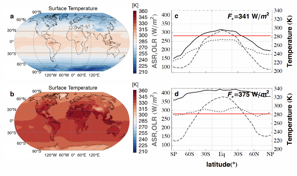 Obr. 7: (vľavo) Priemerná globálna teplota a (vpravo) globálna radiačná bilancia v prípade súčasného žiarivého výkonu Slnka (a) a stavu pred spustením nekontrolovateľného skleníkového efektu zemskej atmosféry (b) - z obrázku vyplýva, že scenár nekontrolovateľného otepľovania je pravdepodobný až v prípade zvýšenia priemernej globálnej teploty výrazne nad 50 °C [Zdroj]