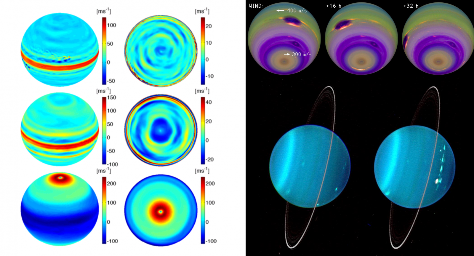 Obr. 2: (vľavo) Príklad modelovej simulácie vplyvu uvoľňovania latentného tepla (pri kondenzácii napr. vodnej pary), rýchlej rotácie planéty a intenzity slnečného žiarenia na pole rýchlosti vetra v horných vrstvách atmosféry Jupitera (vľavo hore), Saturnu (vľavo v strede) a Uránu, Neptunu (vľavo dole); (vpravo) infra-červené zábery Neptúnu (hore) a Uránu (dole) poukazujú na intenzívnejšie uvoľňovanie latentného tepla a vyššie rýchlosti vetra v miernych a polárnych šírkach ako pri rovníku [Zdroj: Showman 2008, NASA]