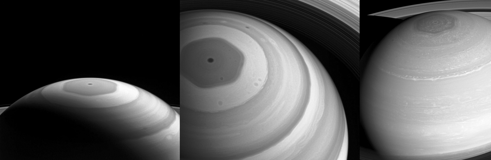 Obr. 15: Atmosférický polárny vortex v okolí severného pólu pripomínajúci obrovský hexagón na zábere sandy Cassini zo vzdialenosti približne 1,4 mil. km od povrchu oblačnosti [Zdroj: JPL NASA]