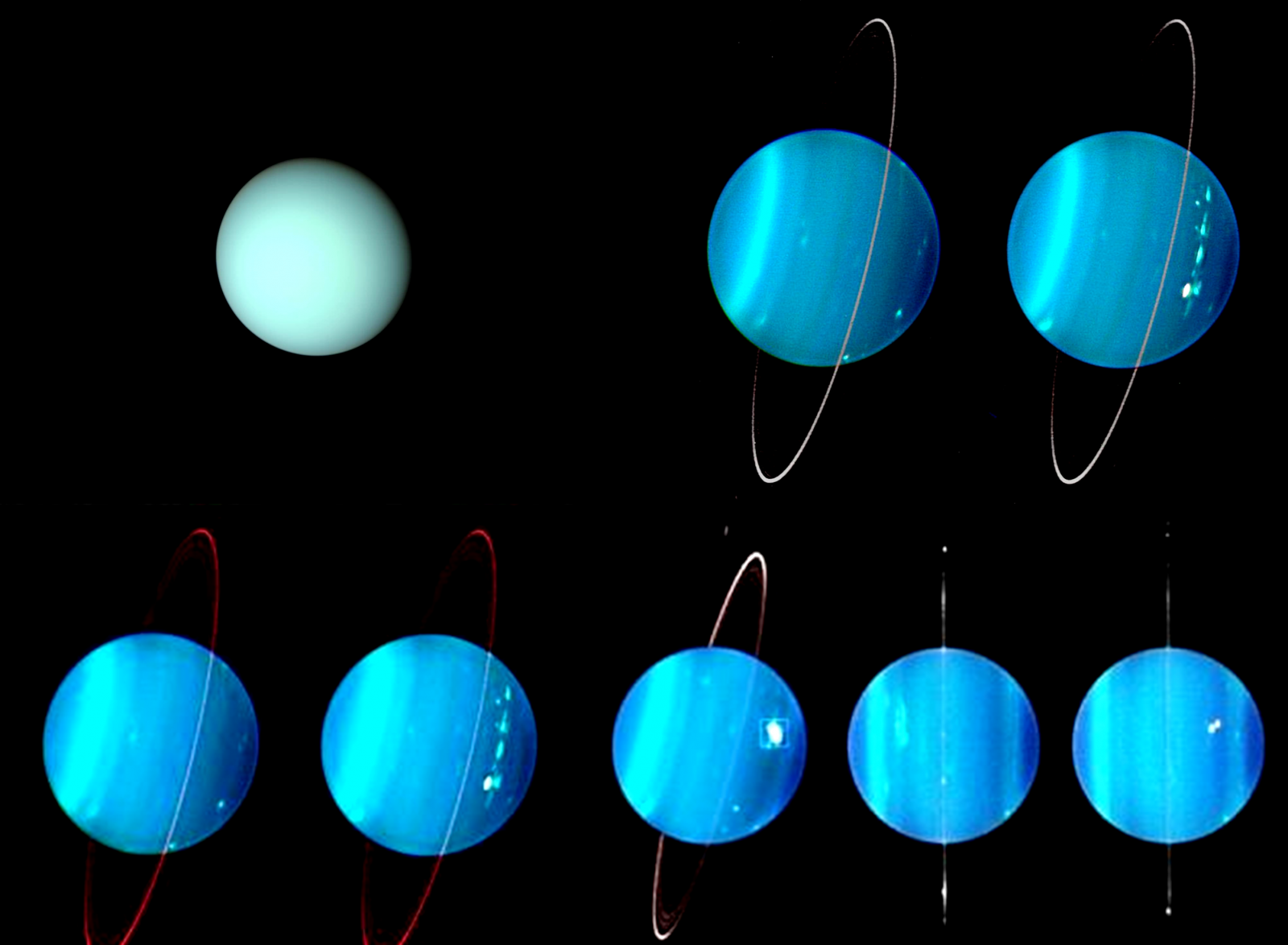 Obr. 16: (hore vľavo) Urán na zábere sondy Voyager 2 z roku 1986, vpravo hore na zábere z teleskopu Keck a dole snímka z Hubblovho teleskopu v infračervej oblasti spektra poukazujú na nárast atmosférickej aktivity v tropických šírkach príchodom jarnej rovnodennosti [Zdroj: JPL NASA]