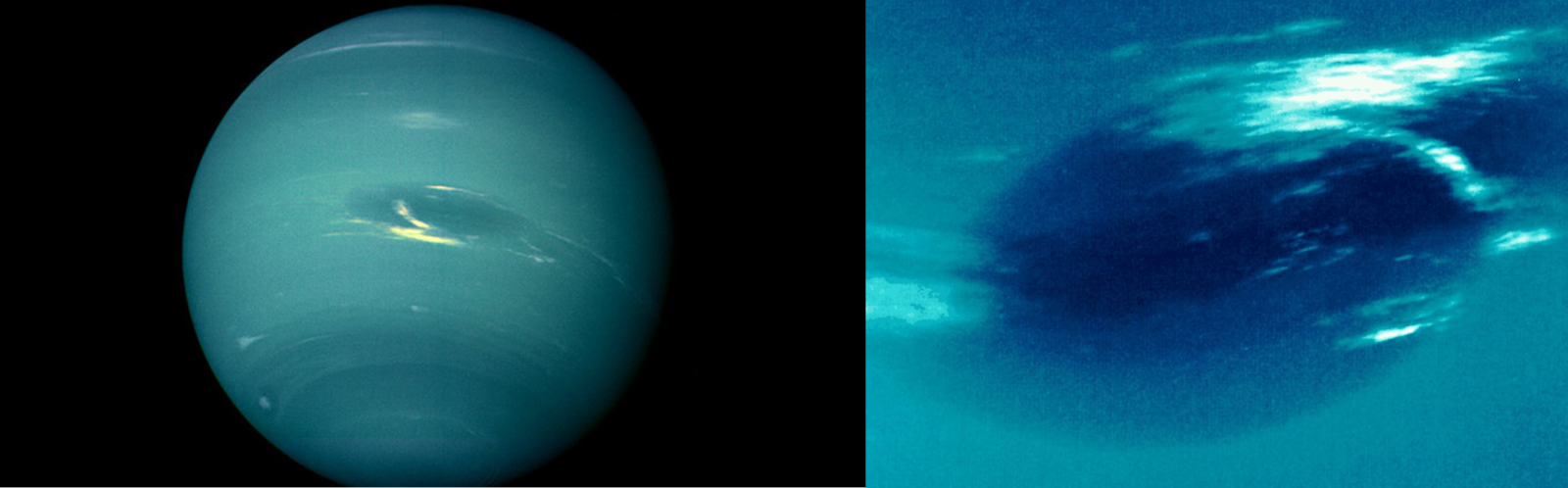Obr. 17: Neptún so svojou Veľkou tmavou škvrnou - detail vpravo - na zábere zo sondy Voyager 2 z roku 1989 [Zdroj: JPL NASA]