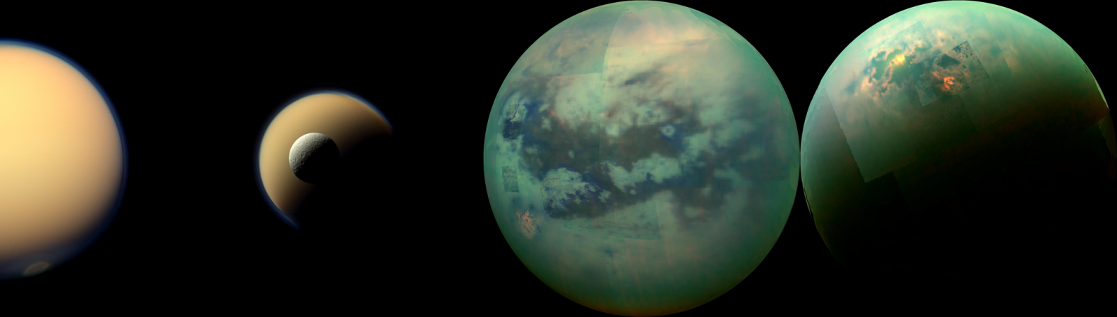 Spomedzi veľkých telies slnečnej sústavy stojí za pozornosť aj jeden z najväčších mesiacov slnečnej sústavy, väčší ako planéta Merkúr, o ktorom vieme, že má hustú atmosféru podobnú tej našej pozemskej. Ide o najväčší mesiac planéty Saturn – Titán. Atmosféra Titánu je síce asi 5 až 6-krát hustejšia a čo do výšky siaha vyššie (je vysoká asi 700 km; na Zemi je to približne 200-250 km), no chemickým zložením je pozemskej veľmi podobná. Sú to jediné dve atmosféry v našej sústave, ktoré sú bohaté na molekulárny dusík. Jedinou výraznejšou odlišnosťou je vyššie zastúpenie metánu, ktoré v prípade Titánu dosahuje až 5 % (na Zemi je to 0,0001745 %). Veľmi ťažké je však vysvetliť, ako Titán prišiel k svojej hustej organickej atmosfére (Obr. 18). Vieme predsa, že väčšina ostatných ľadových terestrických telies, počnúc Jupiterovými mesiacmi a končiac veľkým Neptúnovým mesiacom, Tritónom, žiadnu významnú atmosféru nemajú. Odpoveď nie je jednoduchá, no dá sa všeobecne povedať, že všetky faktory, ktoré ovplyvňujú to, či si teleso udrží atmosféru alebo nie, stáli počas celého vývoja Saturnovho systému satelitov na strane Titánu. Relatívne slabé magnetické pole Saturnu, časté, ale pritom pomalé impakty malých telies na povrch mesiaca, či napríklad aj optimálna veľkosť a povrchová teplota (-180 °C) zohrali v tomto nezanedbateľnú úlohu. Okrem fyzikálnych a chemických vlastností titánovská atmosféra zaujme aj svojou značnou aktivitou, ktorú by človek na tak chladnom mieste slnečnej sústavy rozhodne nečakal.