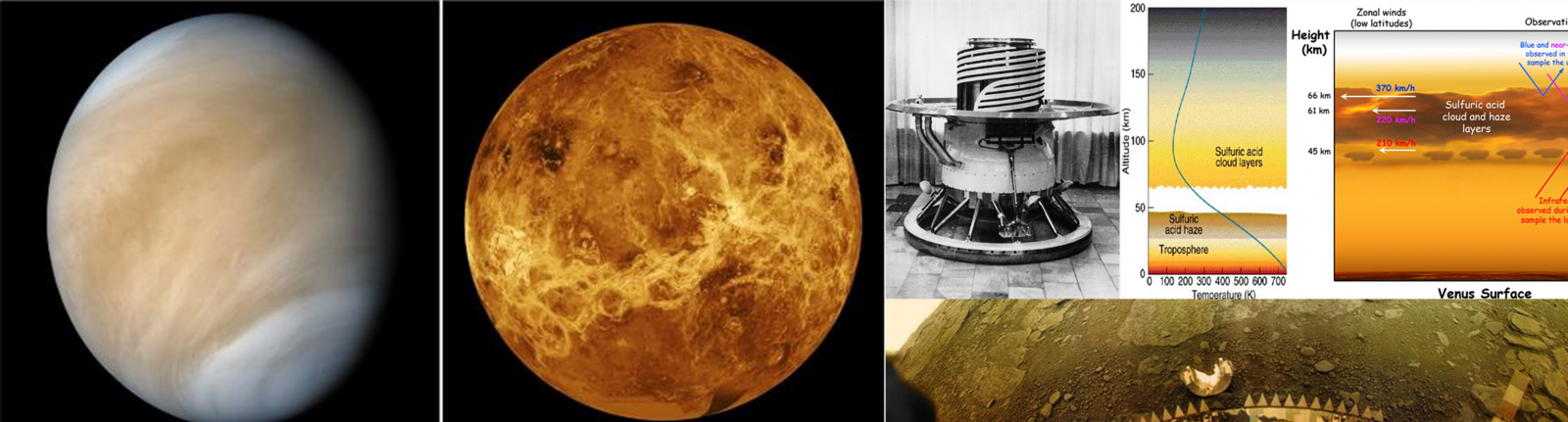 Obr. 4: (vľavo) Planéta Venuša so svojou mohutnou oblačnosťou (v IR kanále) a bez nej (Zdroj: NASA); povrch Venuše v podobe topografickej mapy si možno prezrieť tu: Topografická mapa Venuše (Zdroj); (vpravo) na Venuši zatiaľ pristála len sovietská kozmická sonda Venera, ktorej sa podarilo zmapovať nielen vertikálny profil atmosféry (vpravo hore), ale priniesla aj zaujímavé fotografie povrchu (vpravo dole) [Zdroj. JPL NASA]