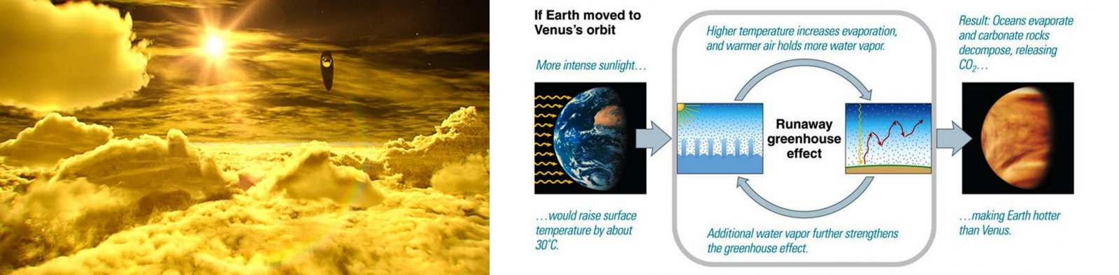 Obr. 5: (vľavo) Umelecká predstava preletu satelitu hornými vrstavmi atmosféry Venuše; (vpravo) zjednodušená schéma fungovania "nekontrolovateľného" superskleníkového efektu v prípade, ak by sa Zem presunula na úroveň obežnej dráhy Venuše - ide o hypotetický scenár [Zdroj: NASA]