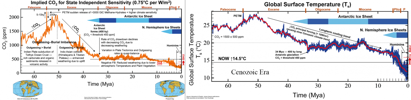 Obr. 8: Rekonštrukcia vývoja globálnej koncentrácie oxidu uhličitého (vľavo) a globálnej teploty (vpravo) v období posledných 65 miliónov rokov na základe výskumu morských a jazerných sedimentov a ľadovcových jadier [Zdroj]