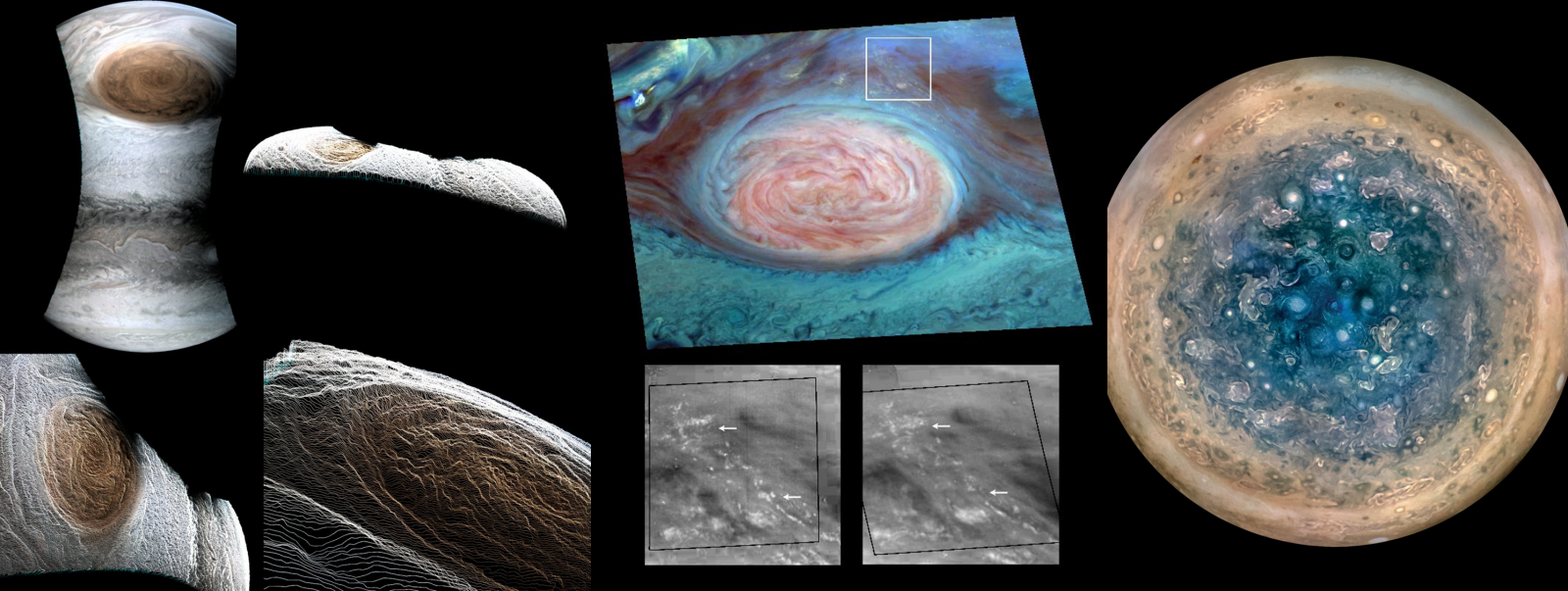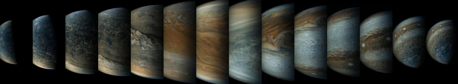 Obr. 13: Sekvencia záberov Jupitera a jeho atmosféry, ktorú sonda Juno urobila v priebehu roka 2016 a 2017 [Zdroj: JPL NASA]