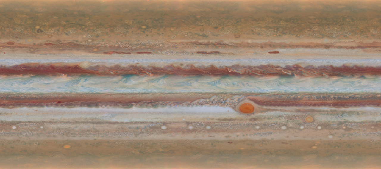 Obr. 11: Mimoriadne dynamická a pestrá zonálna štruktúra atmosféry Jupitera (GIF animácia) pozostávajúca zo svetlejších zón a tmavších pruhov, ktoré sa pohybujú v opačnom smere, Veľká červená škvrna je jasne viditeľná v južnom tropickom pásme [Zdroj: JPL NASA]