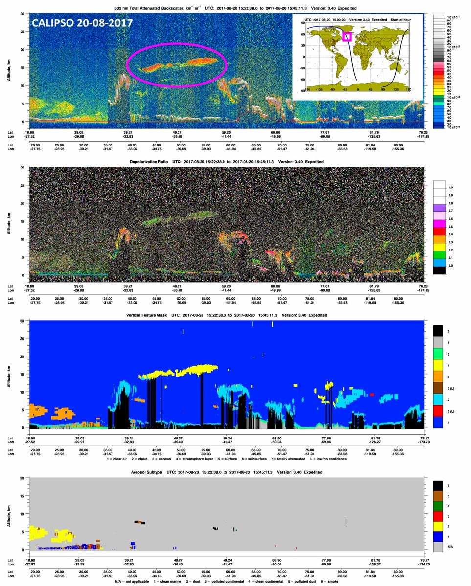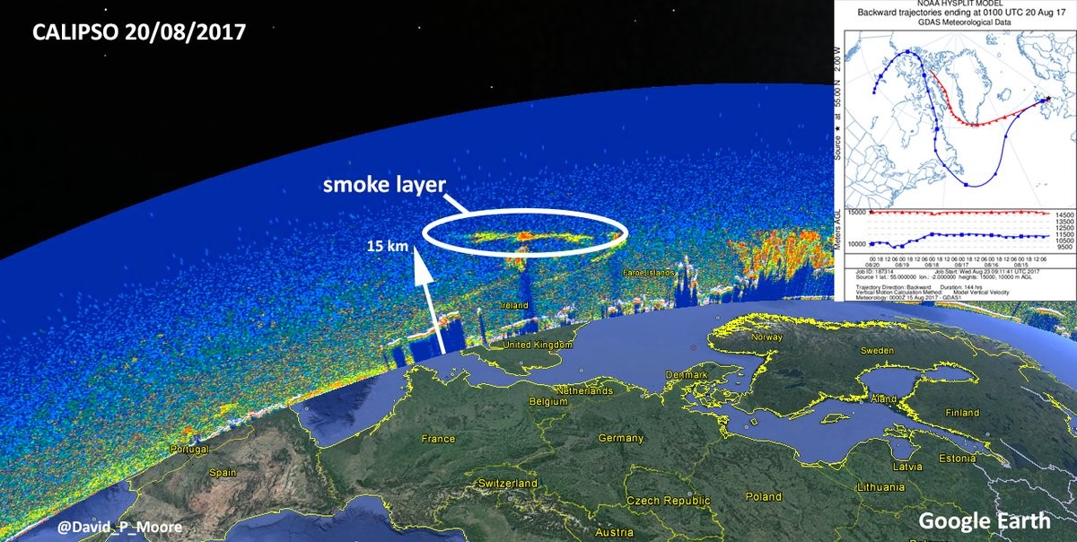 Dym z kanadských požiarov bol v stratosfére zaznamenaný aj na iných miestach. Satelit CALIPSO už v nedeľu 20. augusta 2017 zaznamenal dym vo výškach aj nad 15 km južne od Grónska (Obr. 3). V rovnaký deň bol dym zaznamenaný aj nad Veľkou Britániou (Obr. 4), a to vo výške 10 – 15 km. Pozemný lidar zaznamenal tento aerosól nad francúzskym mestom Lille 23. augusta 2017 vo výškach 14 – 16 km, na stanici Košetice v Českej republike ho registrovali v podobných výškach, 22. a 23. augusta.