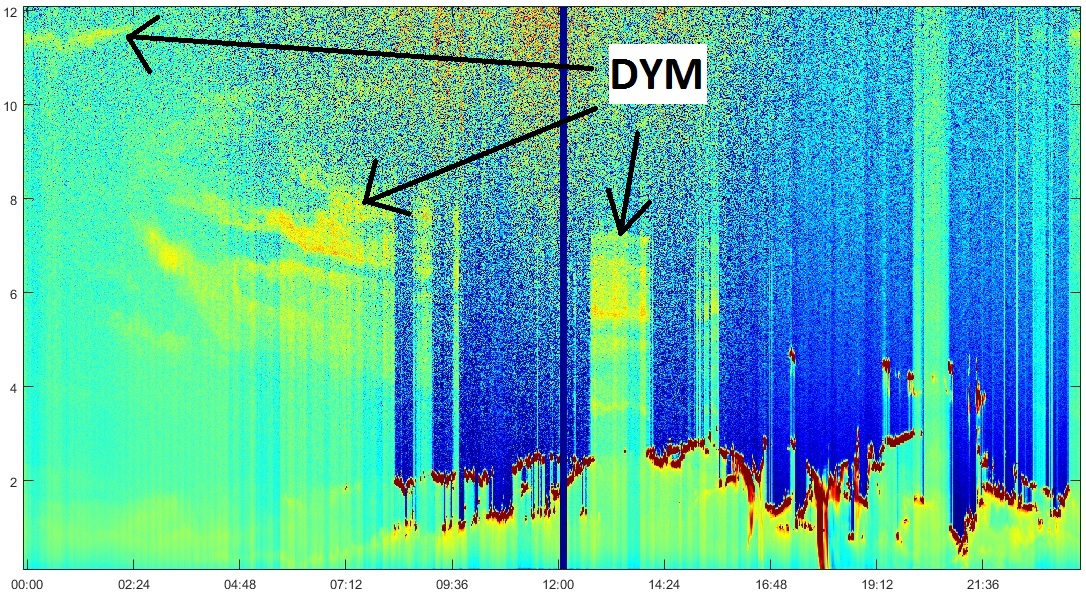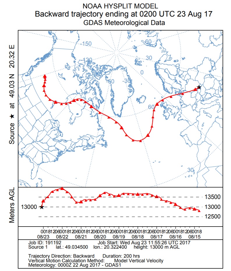 Od nedele (20.8.2017) sa nad Slovenskom vyskytovali vrstvy aerosólu, ktorý s vysokou pravdepodobnosťou pochádzal z požiarov v Kanade. Tento dym bol detegovaný pomocou lidaru v Gánovciach pri Poprade. Na priložených obrázkoch môžeme vidieť vertikálny profil aerosólov pre 22. a 23. august 2017 (čas je UTC). V utorok (22. augusta 2017) sa zvýšené množstvo aerosólov nachádzalo v rôznych vrstvách vo výškach od cca 4 do 12 km nad terénom (nadmorská výška terénu je 706 m n. m.). Oveľa zaujímavejšia situácia nastala nasledujúci deň. Väčšie množstvo aerosólov sme pozorovali vo výškach okolo 12 až 14 km nad terénom. Tropopauza sa v noci z 22. na 23. augusta nachádzala v nadmorskej výške 10,6 km a o 12 hodín neskôr vo výške 9,7 km. Ide o výnimočnú situáciu, pretože dym bol detegovyný nad tropopauzou, teda v spodnej stratosfére.