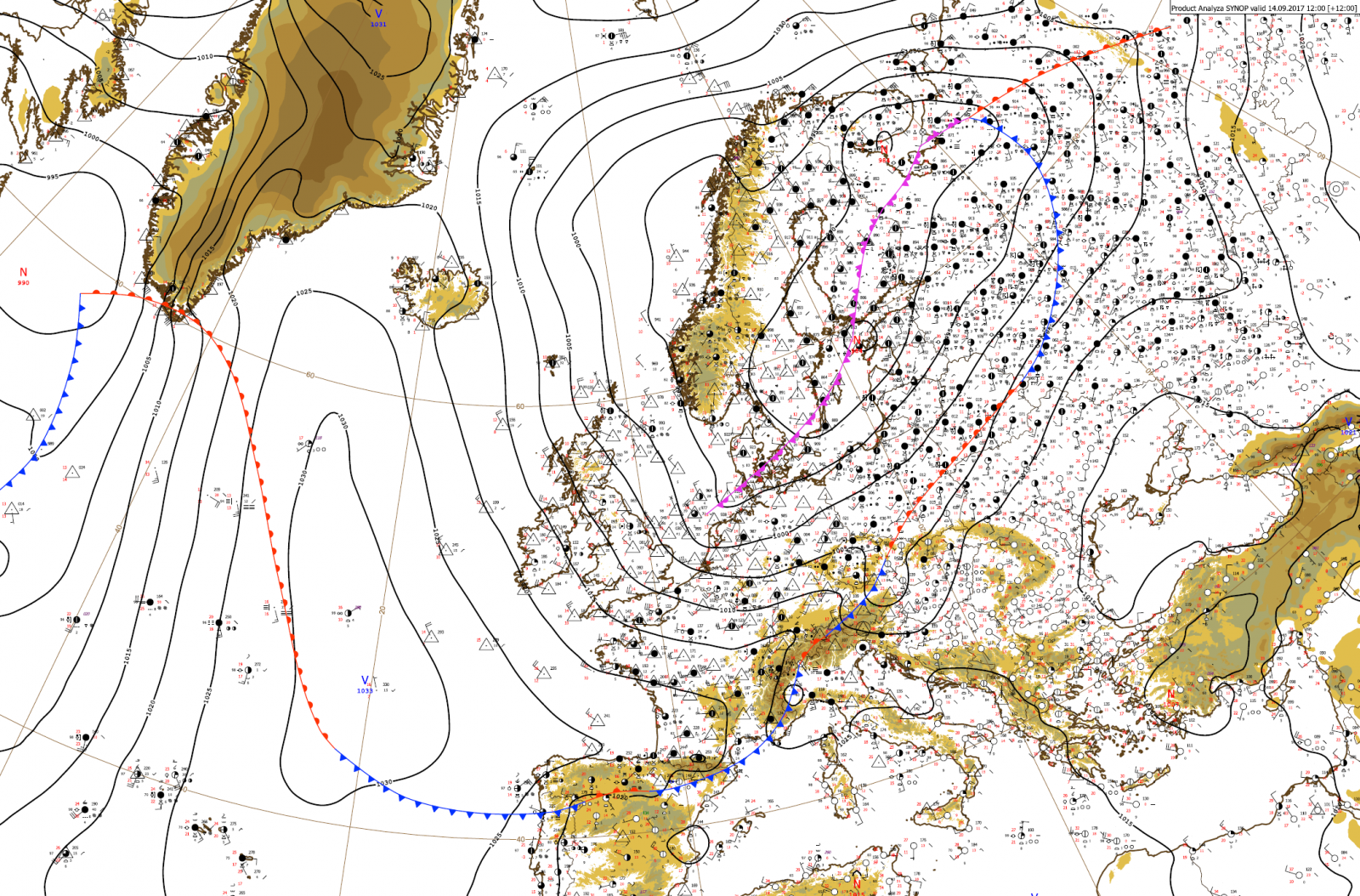Obr. 1 - Synoptická analýza zo dňa 14.9. v čase 12:00 UTC (14:00 LSEČ)