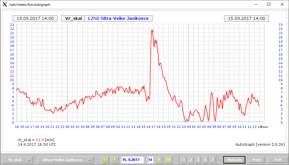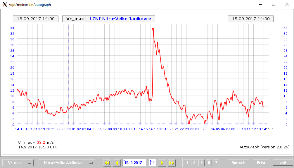 Výstrahy sa začali napĺňať okolo sedemnástej hodiny, keď sa na krajnom západe Slovenska zmenil vietor na severozápadný a výrazne zosilnel. V Kuchyni pri Malackách sme zaznamenali náraz vetra presahujúci 85 km/h. V nasledujúcich desiatkach minút postupoval front ďalej na východ až juhovýchod a s ním sa ďalej na východ :presúvala aj oblasť najsilnejších nárazov vetra (obr. 3 až 7). Najvyššiu rýchlosť vetra sme zaznamenali v Nitre, kde o pol siedmej (18:30 LSEČ) dosiahol náraz vetra až 120 km/h (obr. 8), pričom priemerná rýchlosť dosahovala silu víchrice (obr. 9).