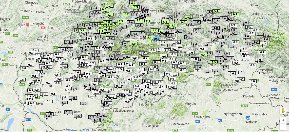 Od našich západných susedov k nám však už postupoval zvlnený studený front, spojený s rozsiahlou tlakovou nížou so stredom nad Škandináviou (obr. 1). V súlade s našimi predpoveďami nepriniesol tento front na Slovensko ešte podstatné množstvo zrážok. Väčšinou sme zaznamenali úhrny od nemerateľného množstva (0,0 mm) do 6 mm, na severe ojedinele aj viac - v lokalite Čierny Váh okolo 10 mm (obr. 2). Spomínaný prechod studeného frontu mal byť zaujímavý najmä vetrom. Slovenský hydrometeorologický ústav naň na väčšine územia juhozápadného Slovenska s predstihom viac než 24 hodín upozorňoval až výstrahou 2. stupňa.